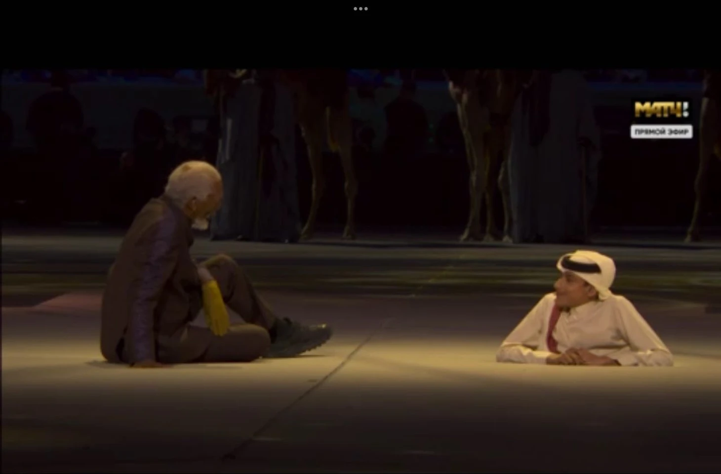 Теперь перед нами эмир Катара – Тамим бин Хамад Аль Тани. Показали кадры его игры в футбол в пустыне, подписанную футболку, а затем было приветственное выступление.