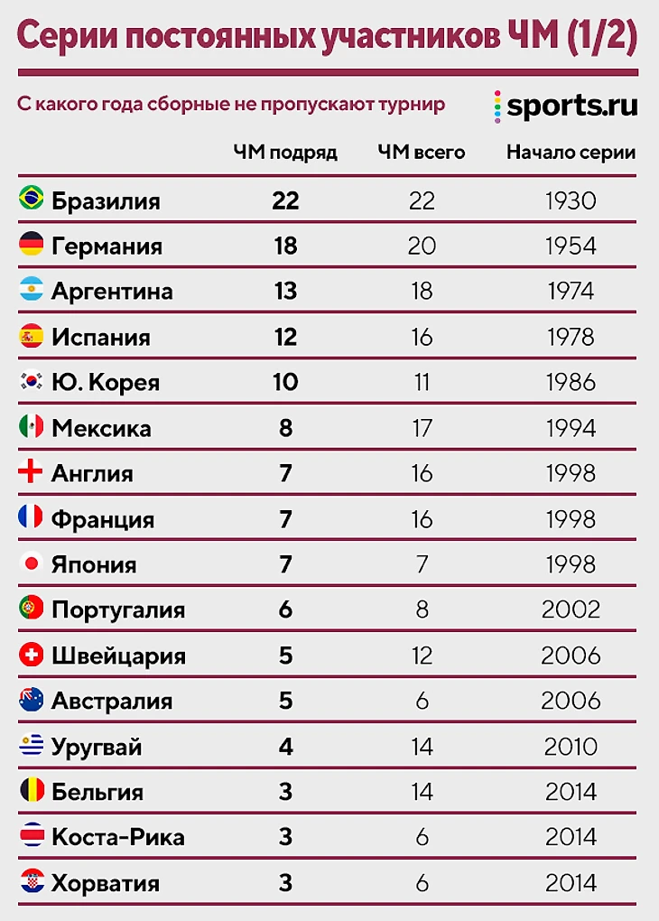 На другом полюсе относительно хозяев турнира Бразилия: южноамериканцы приехали на 22-й ЧМ подряд. То есть они были на всех!