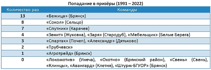 И ещё! «Сокол» - единственная команда, принимавшая участие во всех чемпионатах Брянской области в российской истории (1991 – 2022).