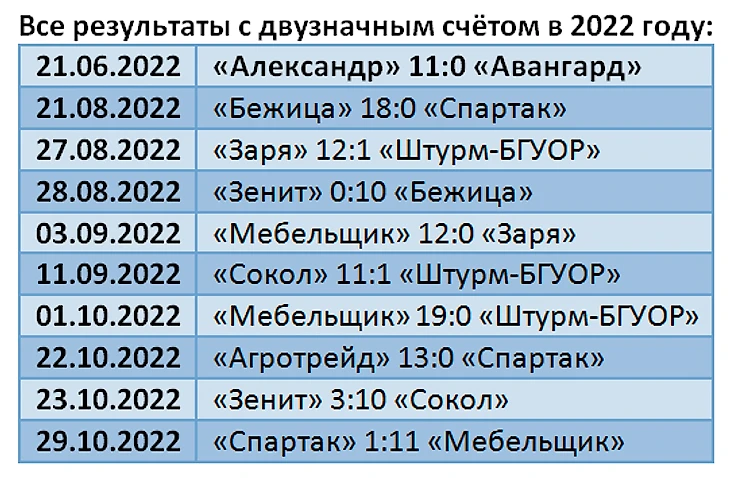 Разгромы с двузначным счётом в 2022 году фиксировались 10 раз (в 2021 – 6 раз).