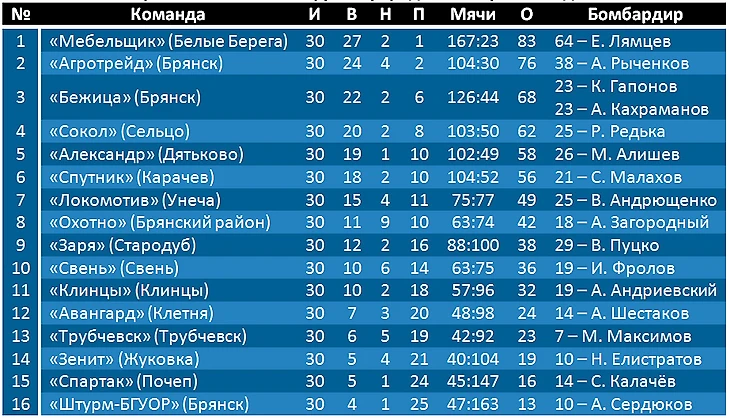 Кроме того, «Бежица» - единственная команда чемпионата, забивавшая мячи во всех 30 матчах.