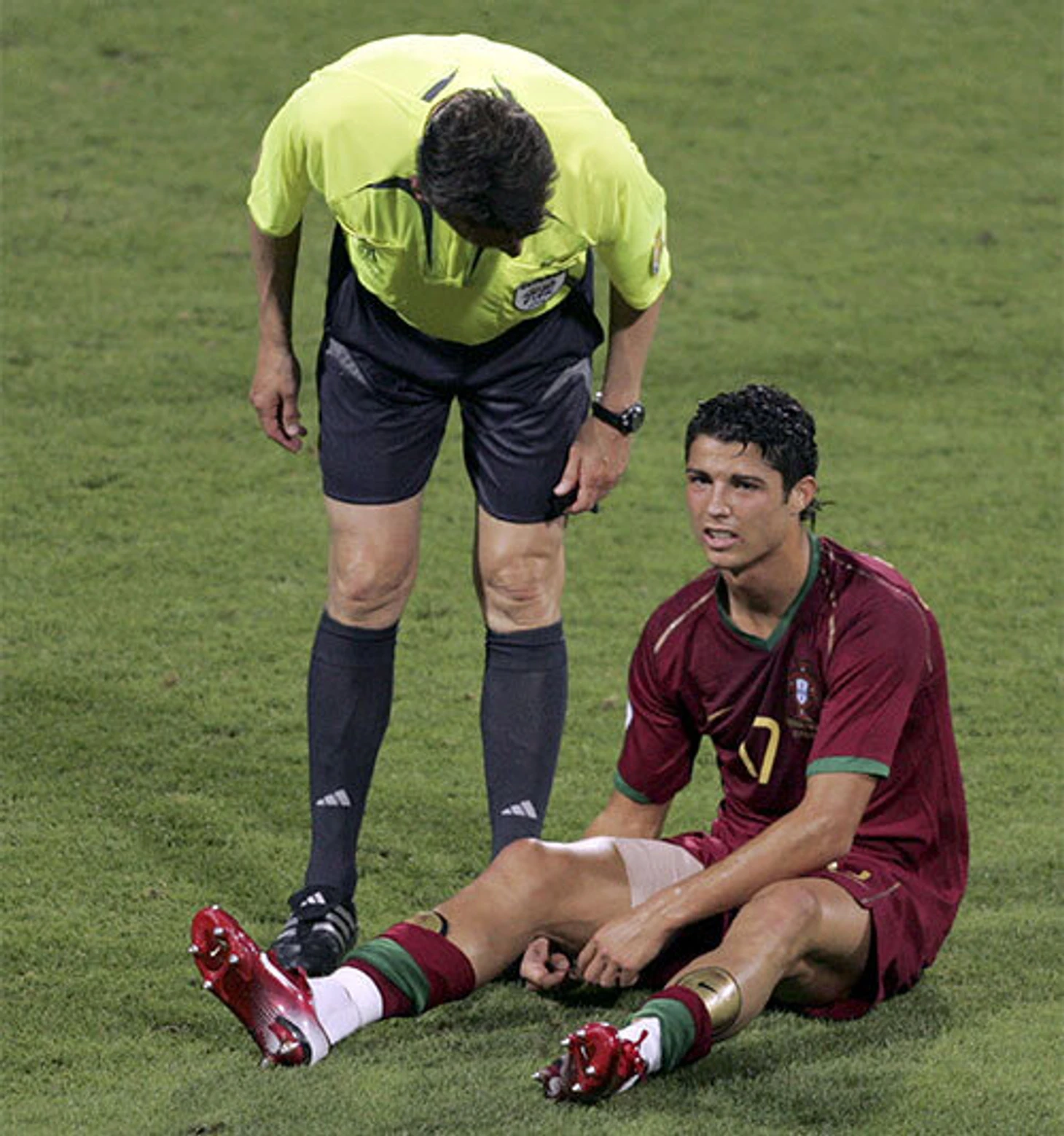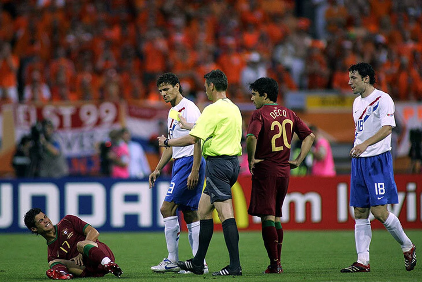 Уже к 7-й минуте по желтой карточке получили Марк ван Боммел (кто бы сомневался) и Халид Буларуз. И если предупреждение ван Боммела еще выглядит неочевидным, то Буларуз по современным правилам вообще сразу пошел бы в раздевалку: воткнулся шипами в бедро Криштиану Роналду, юную звезду португальцев унесли на носилках в раздевалку.