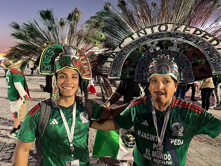 Родриго и Эктор выделяются даже среди мексиканцев. У папы Эктора – 13 чемпионатов мира, он ездит на все с 1982 года (ему – 62). У сына Родриго – 3 турнира, первый – Бразилия-2014, любимый – Россия-2018 (ему – 22). Эти шапки называются «пеначо». Когда-то в такой ходили короли ацтеков и майя, например, Монтесума. Теперь футбольные болельщики, чтобы показать мексиканскую культуру.