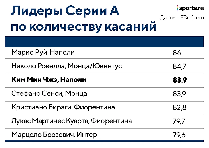 Еще больше поражает, насколько Ким хорош с мячом. Точный пас – не совсем то, чего ожидаешь от защитника шириной с плазменный телевизор и прозвищем «Монстр». Он слишком большой и неловкий, чтобы выдавать затяжные спринты в стиле Кулибали и безошибочно противостоять прессингу, но его передачи стали неотъемлемой частью мощного осеннего «Наполи». Кореец идет 14-м в лиге по точности передач (89,3%) и третьим по количеству касаний – 83,9 за 90 минут (больше только у Ровеллы и Марио Руя).