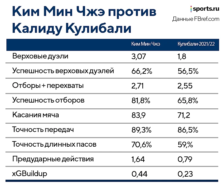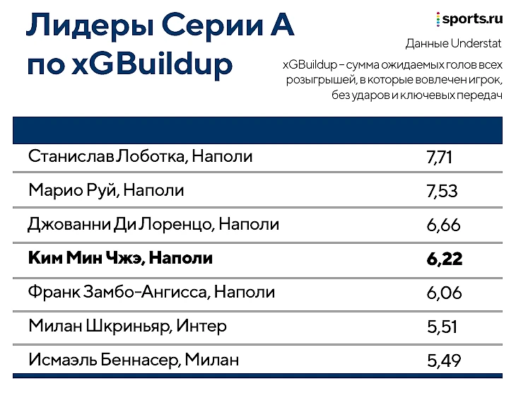 Пас объясняет еще одну неожиданную грань дарования Кима – влияние на строительство атак. Он набил 6,22 ожидаемых гола без учета ударов и пасов под удар (xGBuildup). Это четвертый результат в лиге и лучший среди центрбеков. Отчасти высокие показатели определил эффективный футбол «Наполи» (неслучайно пятерка лидеров – неаполитанцы), но уровень все равно поражает. Кулибали, например, набрал те же 6,22 за весь сезон и занял 103-е место в прошлогодней Серии А.