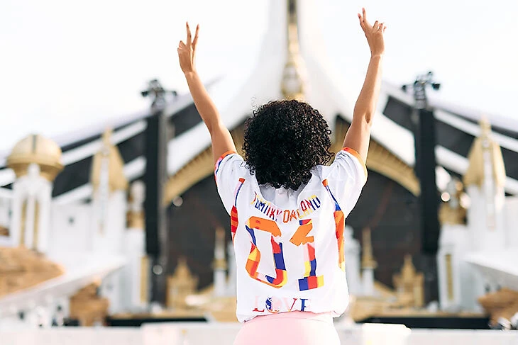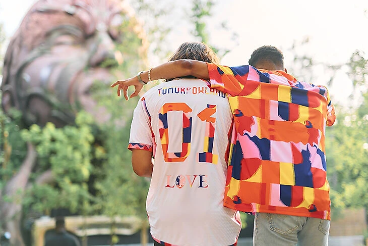 Каждый год на Tomorrowland есть особая тема, вдохновляющая оформителей главной сцены – в 2022-м это было «Отражение любви». Именно так на воротнике белой формы сборной оказалось слово Love, где в букву O вплетен логотип фестиваля. Тренировочная форма, по описанию создателей, цветовым буйством похожа на традиционные фейерверки над фестивалем.