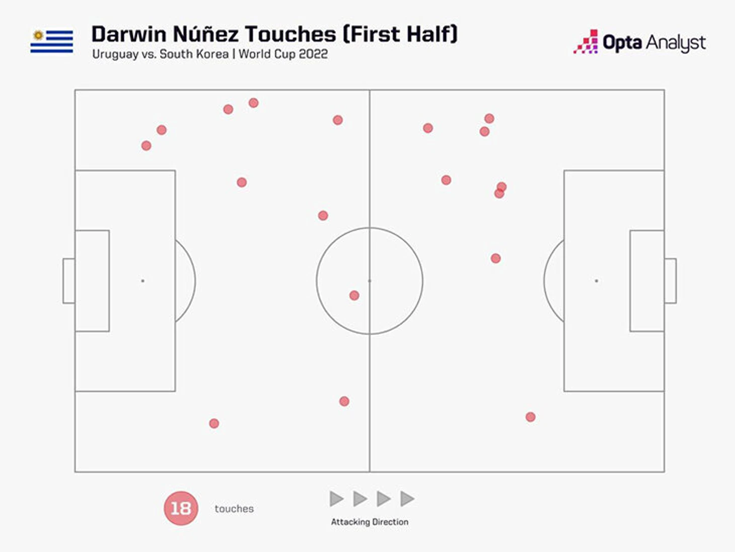 Opta показывала, что Дарвин Нуньес – один из трех полевых игроков Уругвая, которые ни разу не коснулись мяча в чужой штрафной в первом тайме.