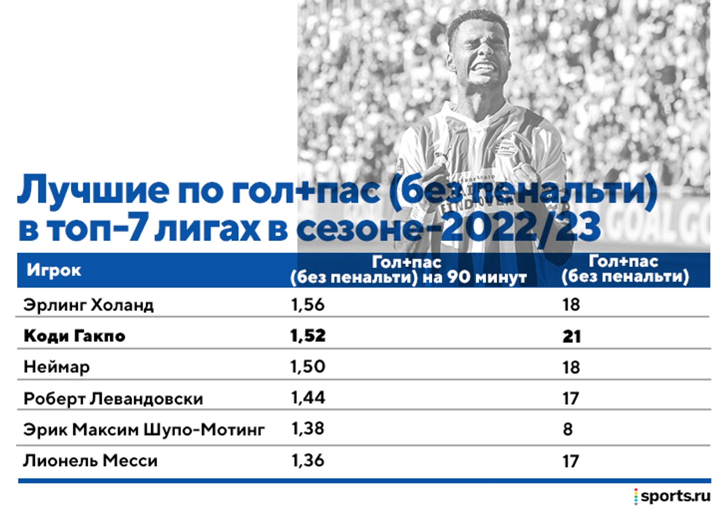 В прошлом сезоне 23-летний голландец собрал 21 гол и 15 ассистов во всех турнирах. Ни один игрок его возраста и младше не раздавал голевые с такой частотой. Только Усман Дембеле и Томас Мюллер превзошли Коди. И это при том, что голевые даже не основная его специализация. На другой чаше весов – уровень и открытость лиги. Это важнейший фактор. О прямом переносе результативности при переходе в топ-чемпионат речи не идет, но уникальность талантов Гакпо очевидна.