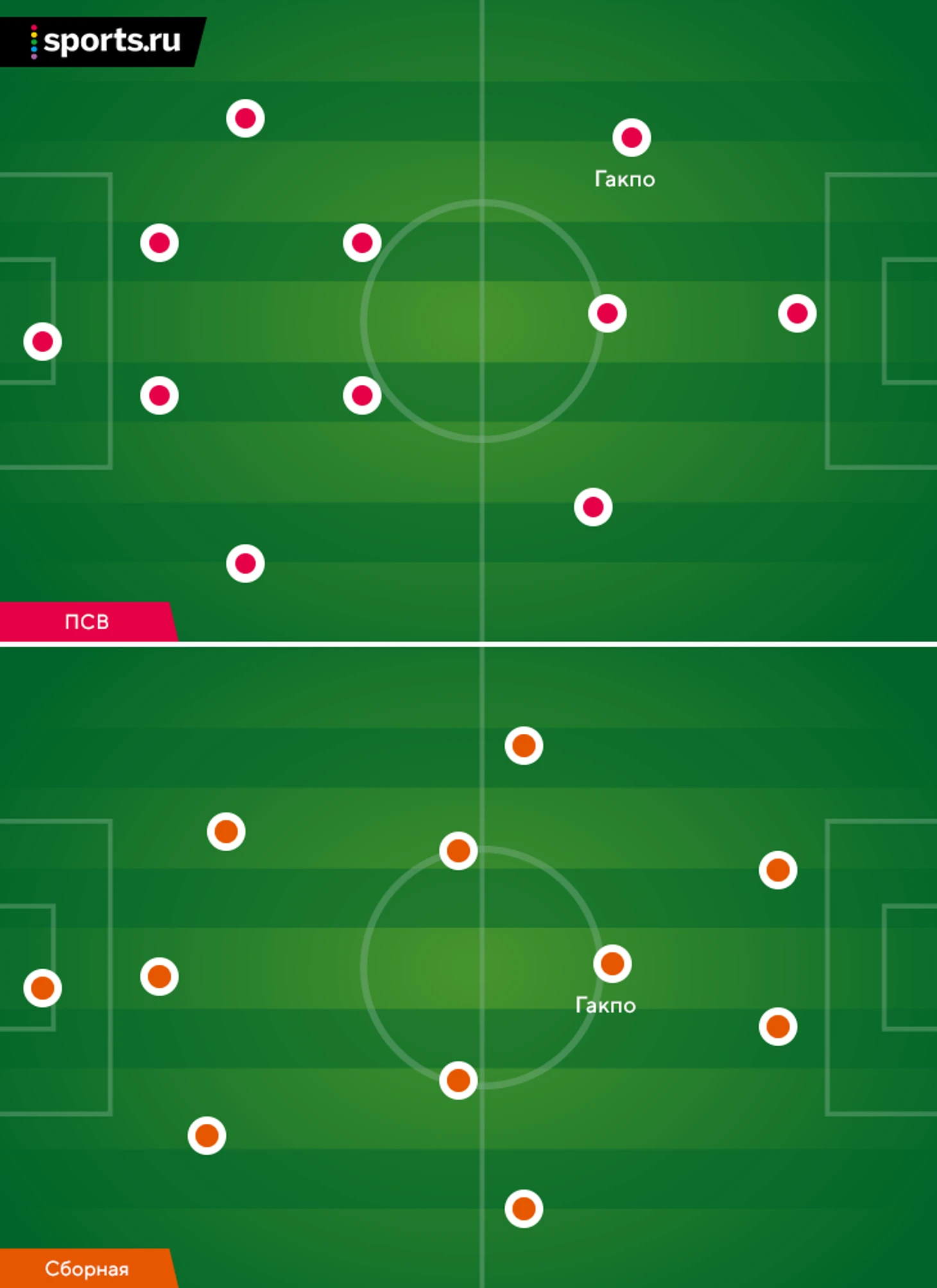 В ПСВ Гакпо играет левого вингера. Современная классика роли – правша, который стартует слева, разгоняется в этой зоне и несет угрозу после смещений. В сборной Луи ван Гал лепит из него десятку – дает ему право смещаться на любой из флангов, но стартовая позиция именно такая: