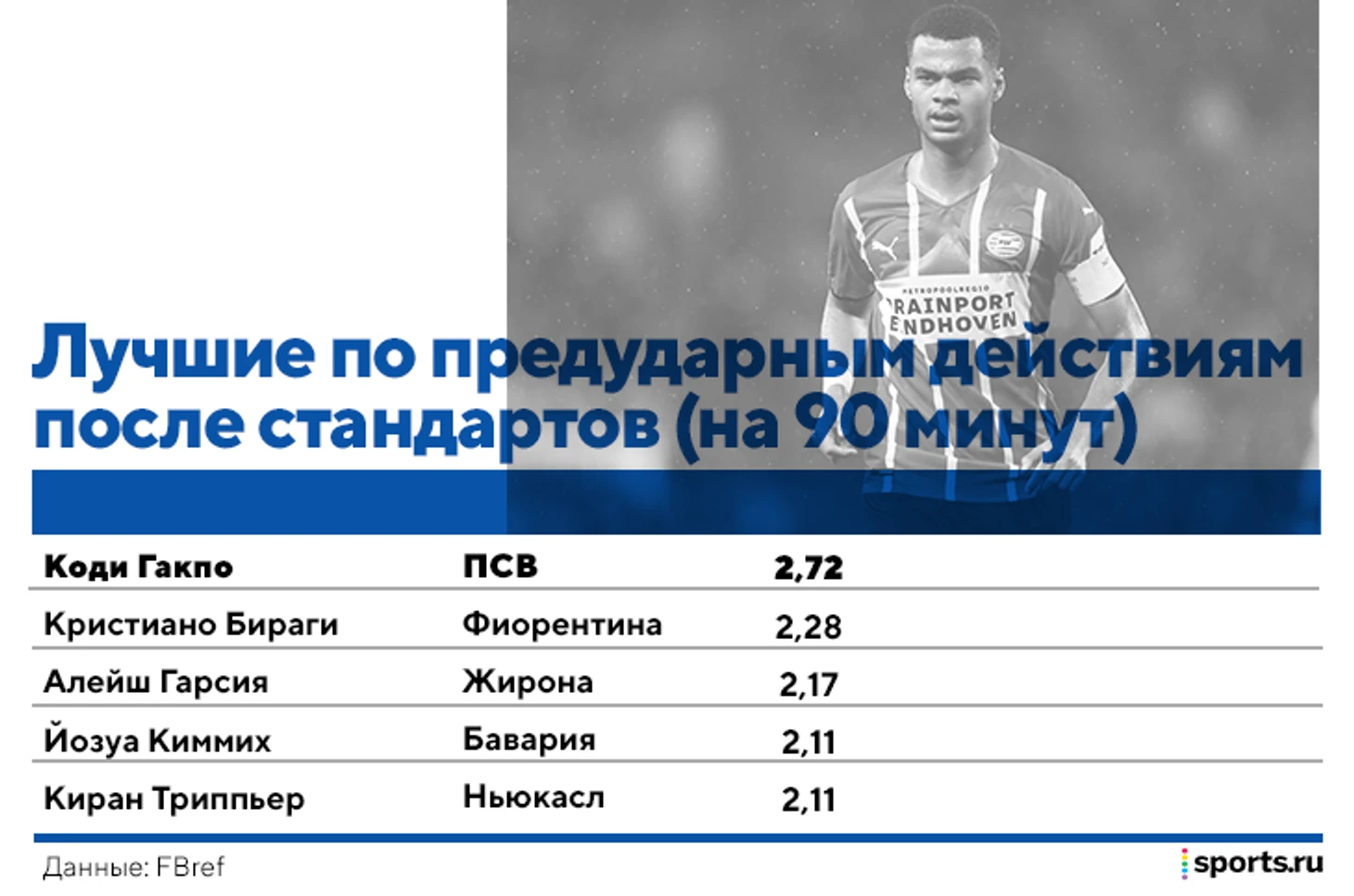 Еще лучше качество подач Гакпо подчеркивает его статистика после стандартов. Он тут с отрывом лучший по предударным действиям (его угловые и штрафные чаще всего прямо или косвенно ведут к моментам):