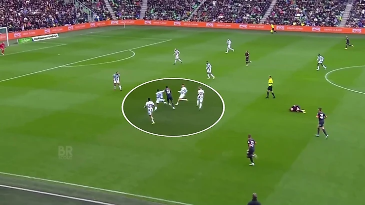 Второй ключевой навык Гакпо – проходы с мячом. У вингера ПСВ крайне эффективная манера дриблинга, которая строится на сочетании мощи и скорости. Он может обыгрывать 1-в-1 на ограниченном пространстве, но по-настоящему опасен, если ему дают разогнаться. В такие моменты он способен собирать по 3-4 оппонента, которые не могут его сдержать: