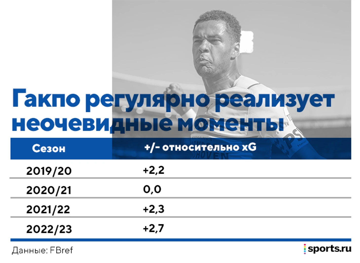 Третий основополагающий элемент стиля Гакпо – исполнение ударов. Он учился не только у Ван Нистелроя: Еще больше взял у Люка Нилиса, которого Роналдо называл «лучшим партнером по атаке». Плоды работы отражаются в статистике – лишь в один сезон его xG не был в плюсе. Обычно он дает команде два «бонусных» гола за сезон. За первую половину текущей кампании собрал уже три: