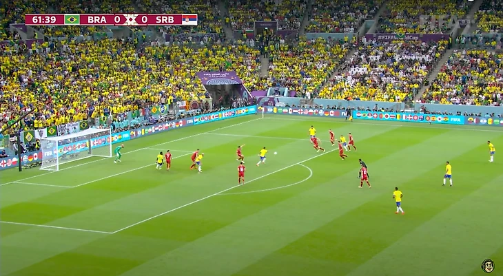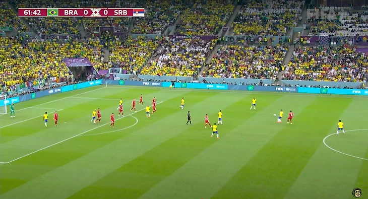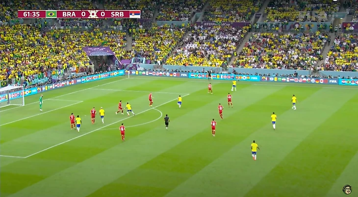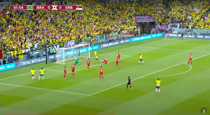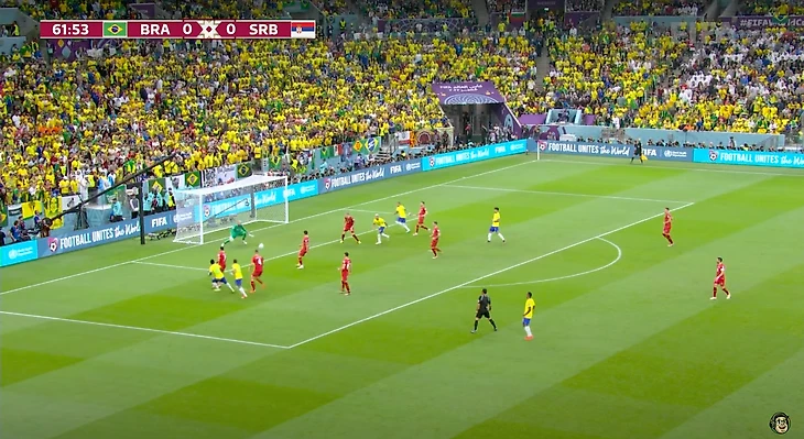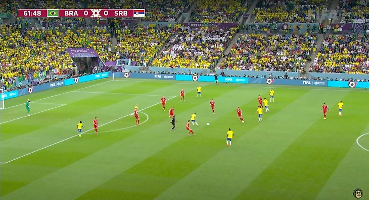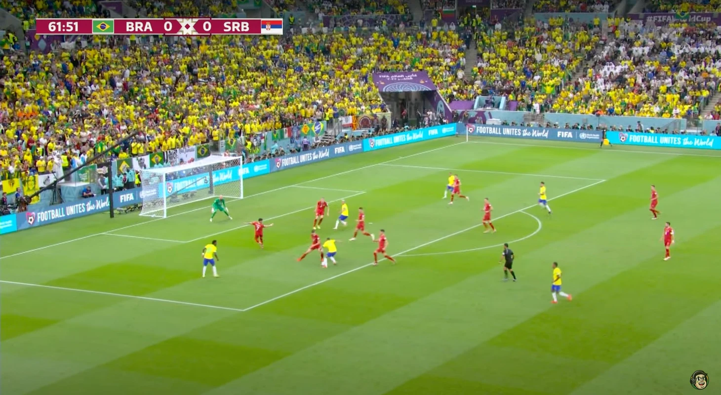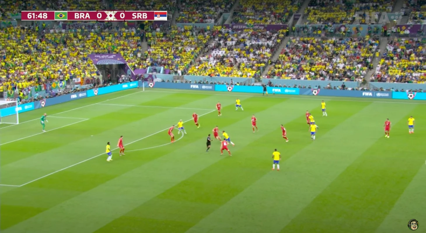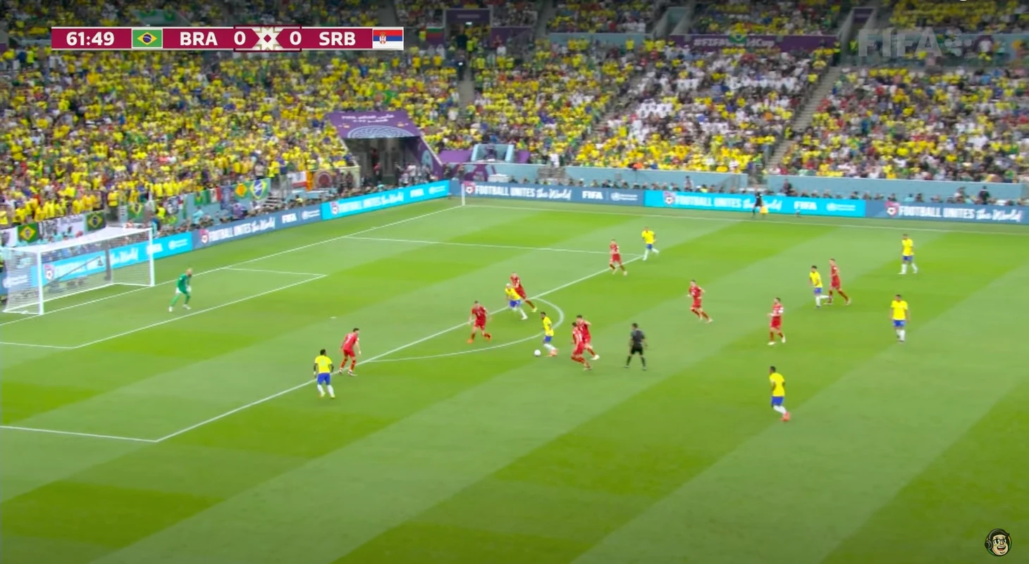 Но это был первый и последний момент в матче, когда младший из Милинковичей-Савичей чувствовал себя героем. Бразильцы стали не только наращивать темп, но и активно бить в слабые места. Помните самые опасные моменты первой половины, когда шикарный пас в штрафную выдал Тиаго Силва, а Винисиус не поверил и слишком поздно стартанул? И второй момент когда Миленкович неуклюже выбил мяч и подарил перехват тому же Винисиусу. Правда Никола сумел исправиться. Вот и сейчас бразильцы закрутили карусель преимущественно своим левым флангом.