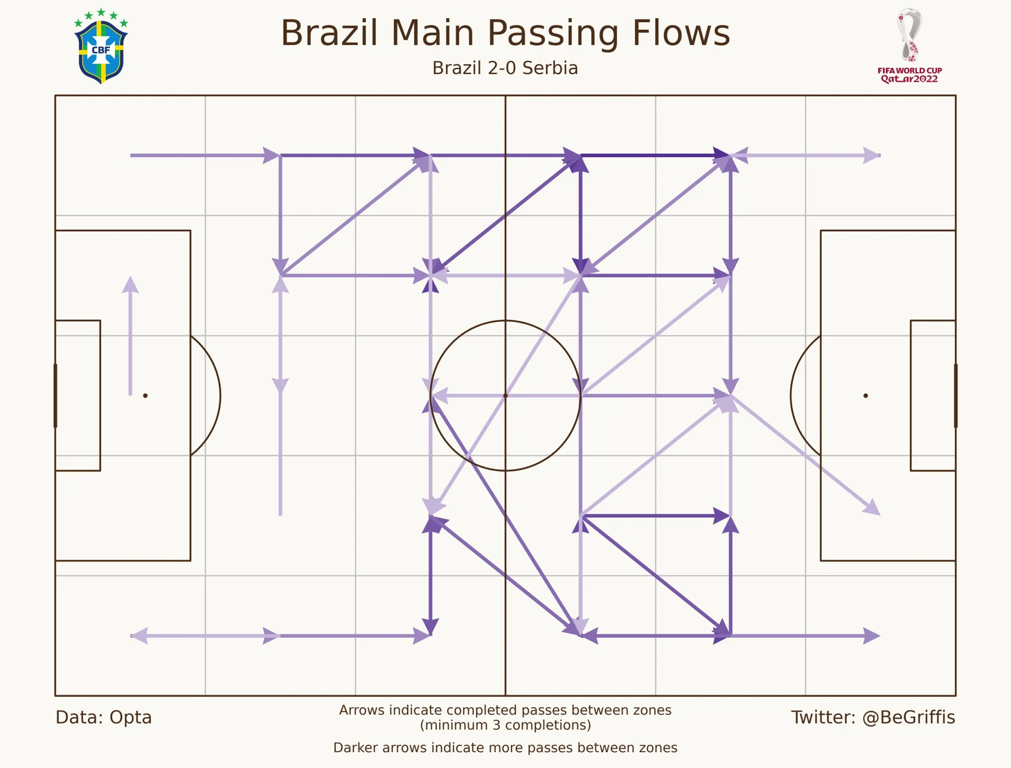 Направления передач. Каждая стрелка-это минимум 3 паса, чем темнее стрелка, тем больше передач
