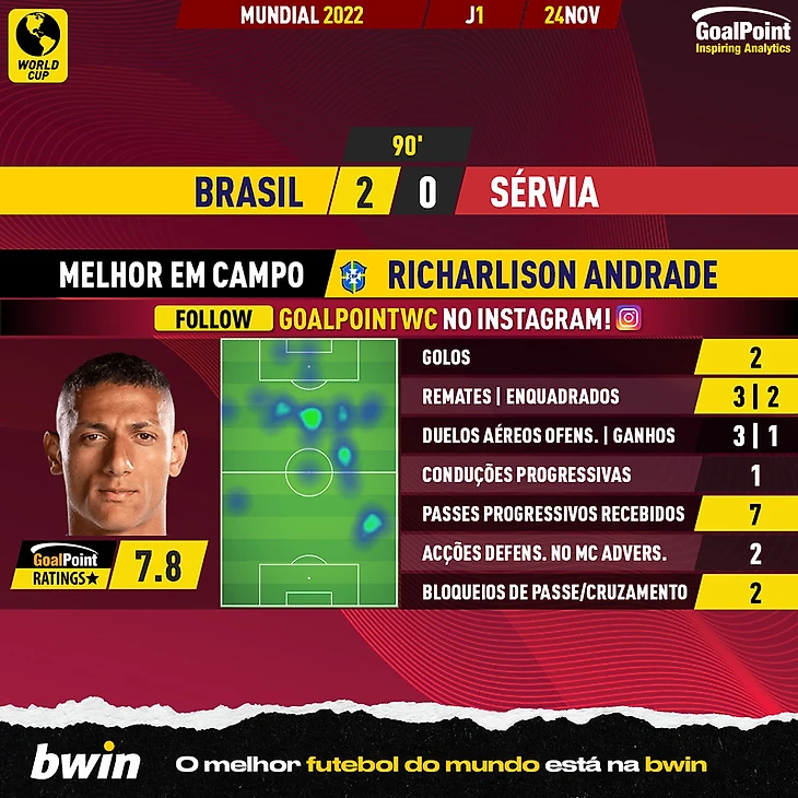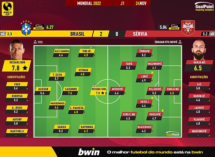 Составы не удивили, у Стойковича была пара перестановок-травма Костича видимо достаточно серьезная плюс Пикси выбрал очень осторожную тактику, предпочитая логично играть на контратаках. Глядя на них весь матч я не совсем понимал КАК они могли обыграть Португалию, пусть даже с такой дырявой обороной, командный выход из обороны либо серьезно барахлил либо отсутствовал как явление. Или может славяне излишне прогнулись в реверансах перед Селесао? В общем все читалось, ничего Стойковичем не было замаскировано из собственных слабостей. Первый матч выдался абсолютно никаким. Борьба, навязанная балканцами, была радостно подхвачена игроками в желтых футболках и только к 25-30 минуте они сказали себе-стоп,что мы творим? Шучу конечно, но уж больно блеклым был тайм. Причины? Неопытность атаки-для всех для них это был дебют в матчах такого накала и некоторые не справились с волнением. Тот же итоговый герой матча Ришарлисон провалил тайм, проиграв максимум, если не все единоборства, плохо навязывая борьбу Павловичу и Вельковичу, да и открывался невпопад. Рафинья был скромен в атакующих действиях, хотя к отработке сзади претензий мало.