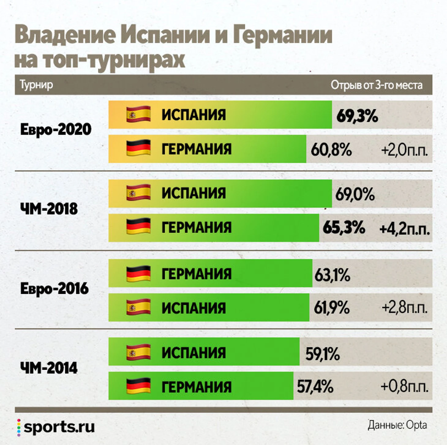 Не всегда так очевидно после первой же встречи, но по итогам всех больших турниров с 2014 года Испания и Германия составляли топ-2 по владению. Более того, с каждым турниром показатели лидирующей сборной становятся более радикальными: