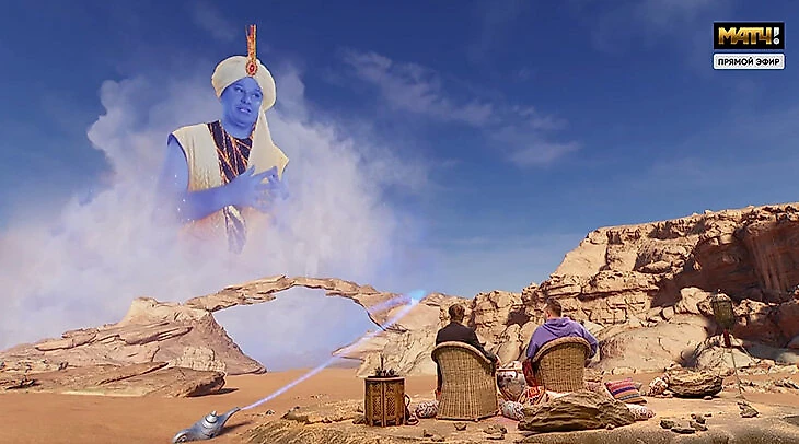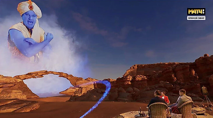 Давайте не забывать, что «Матч ТВ» – канал еще и режиссерский, и к чемпионату мира мы блеснули прекрасными находками со студией в оазисе, с телепортациями. Главным режиссером у нас работает Юра Фроловский, невероятный молодец – он лично и его бригада предложили мне идею с джинном.