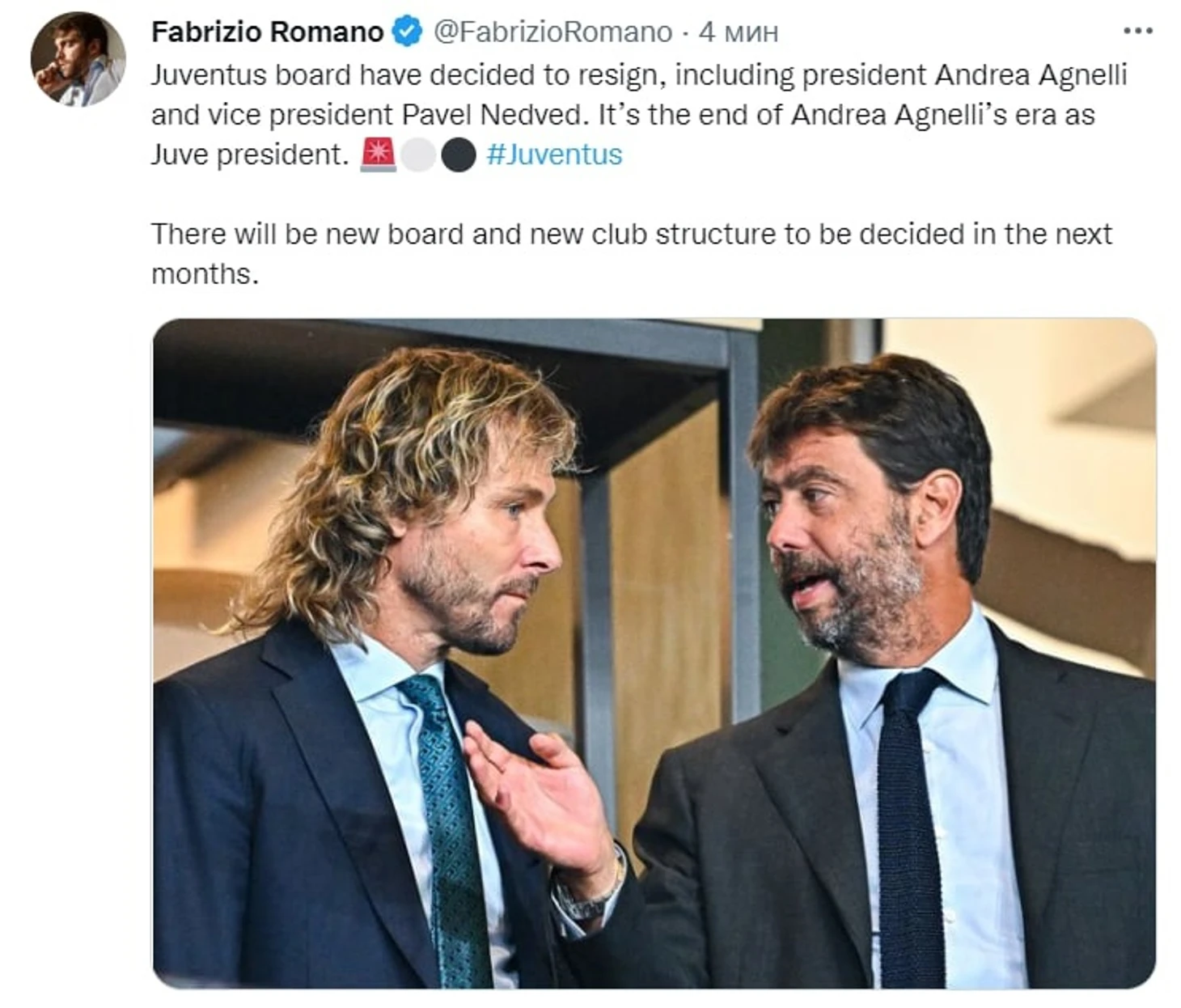Главный инсайдер футбола, Фабрицио Романо, заявил, что совет директоров «Ювентуса» принял решение уйти в отставку. Свои посты также покинули Андреа Аньелли и Павел Недвед.