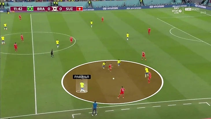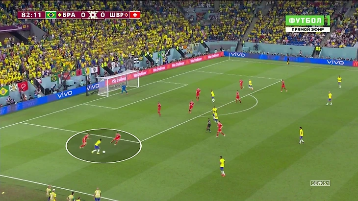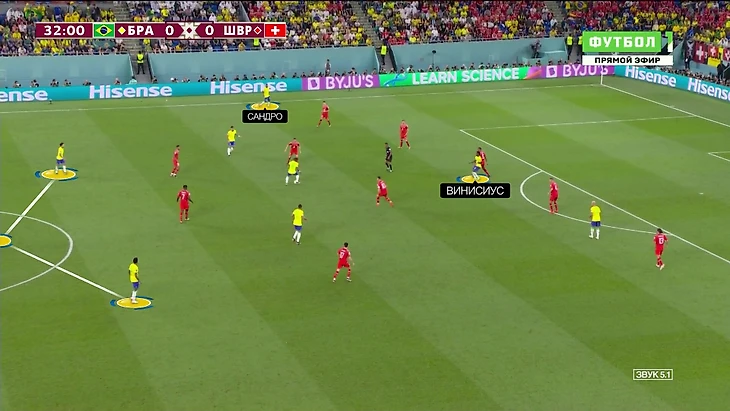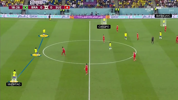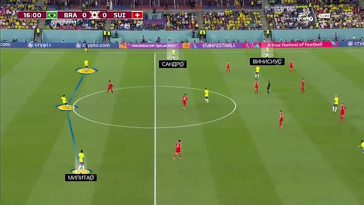 Обратите внимание не только на осторожную позицию Милитао (это предсказуемо), но и на расположение другого флангового защитника – Сандро. Он не закрывает весь фланг, а располагается поглубже. За ширину на этом краю отвечает Винисиус, а справа – Рафинья. И такая структура наблюдалась у бразильцев постоянно: