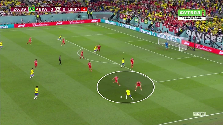 Последний элемент – самый отлаженный и интересный. Бразильцы провоцируют передачи на фланги – порой при обороне Рафинья и Винисиус искусственно располагаются более узко, чем требует эпизод, чтобы спровоцировать соперника отдать на свободного крайнего, а потом начинаются ловушки, в которых у Бразилии численное преимущество: