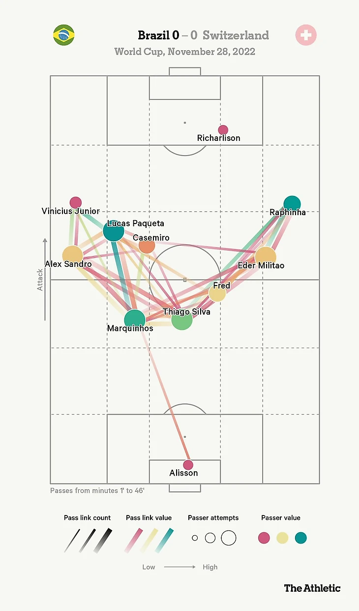 Лучшим портретом Бразилии без Неймара служит карта передач по итогам первого тайма, где стартовый план был выражен наиболее ярко. Нападающий Ришарлисон тотально изолирован от команды, между другими игроками есть плотные связи, но все атаки упираются во фланговых игроков – Рафинью и Винисиуса: