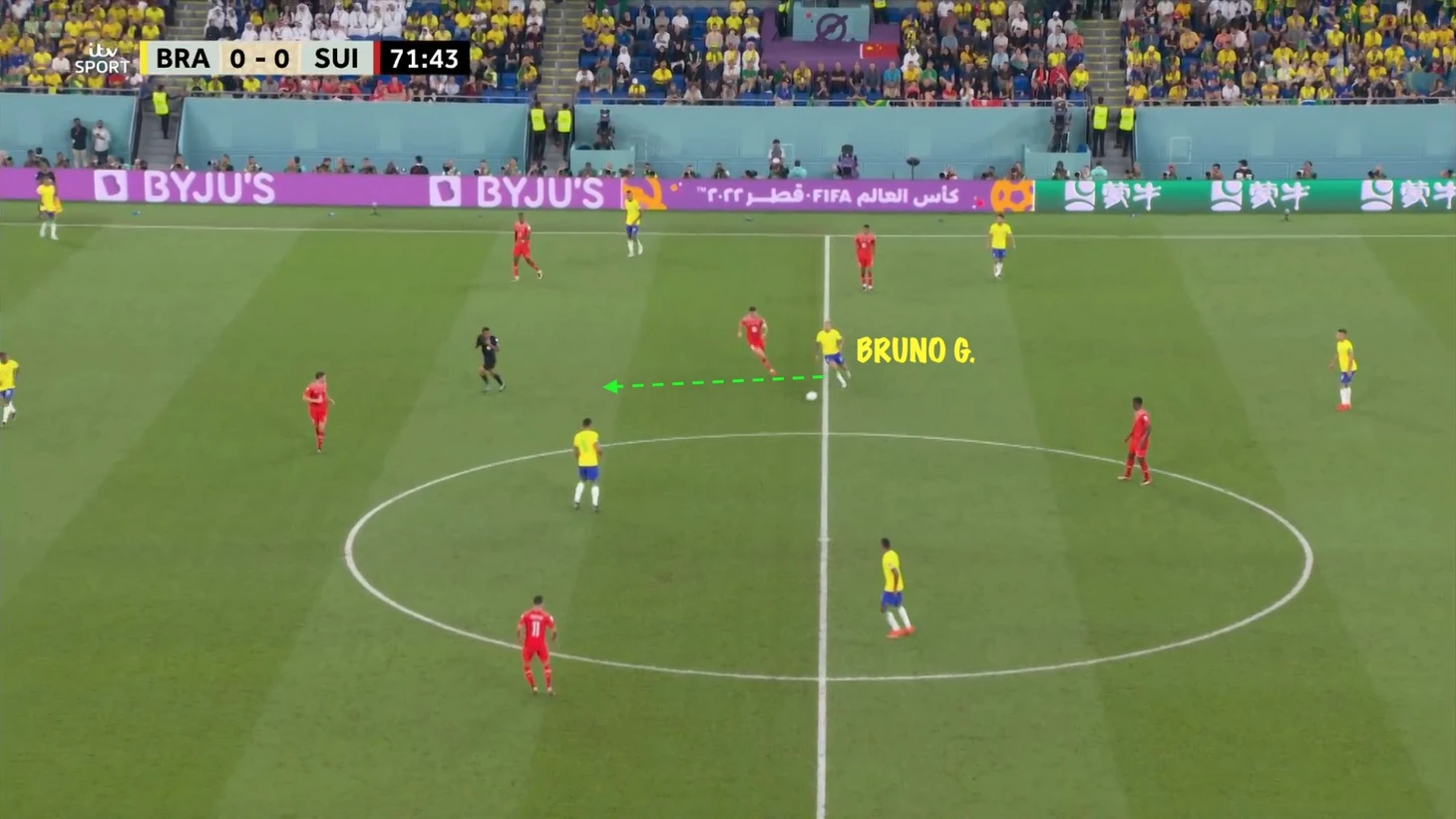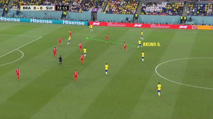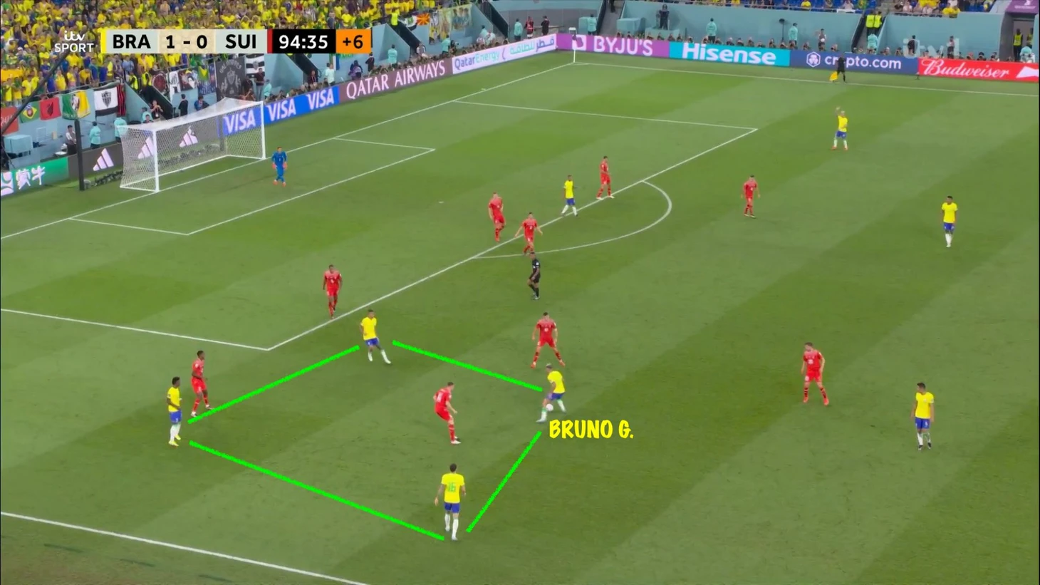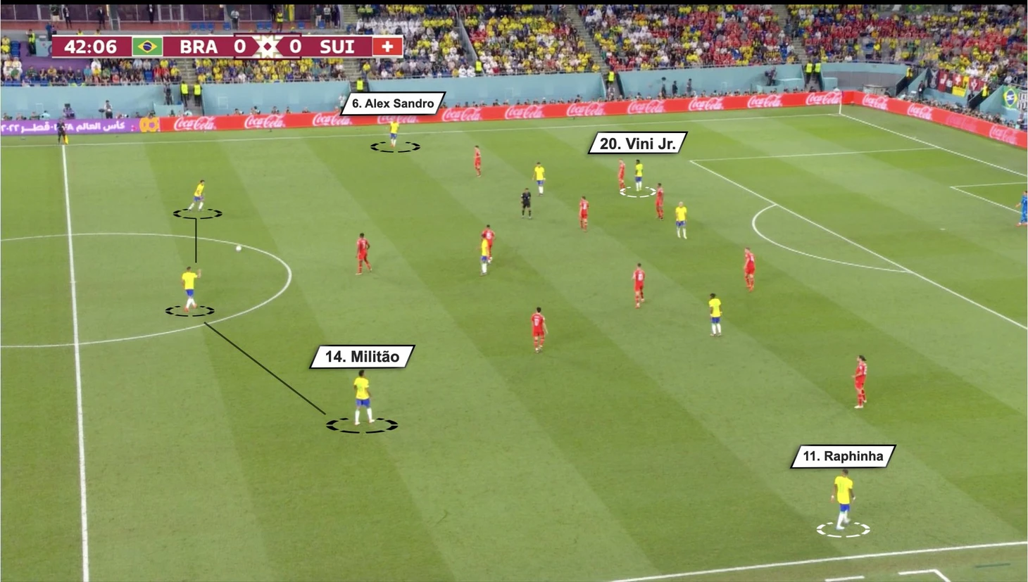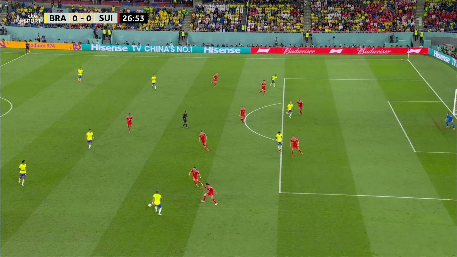 Швейцария усложнила жизнь Бразилии своей стратегией прессинга в первой фазе построения атак и насыщения центральной зоны полузащиты с регулярным давлением на владеющего мячом. В частности Рубен Варгас слева и Эмболо в центре, а также Джибрил Соу и Фабиан Ридер (последний справа) оказывали активный прессинг на бразильскую оборону, не давая им регулярно поддерживать вингеров, которые оставались в гордом одиночестве под присмотром пары опекунов.