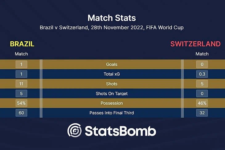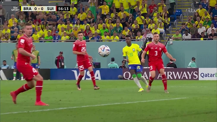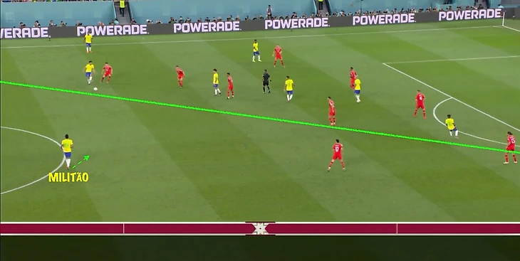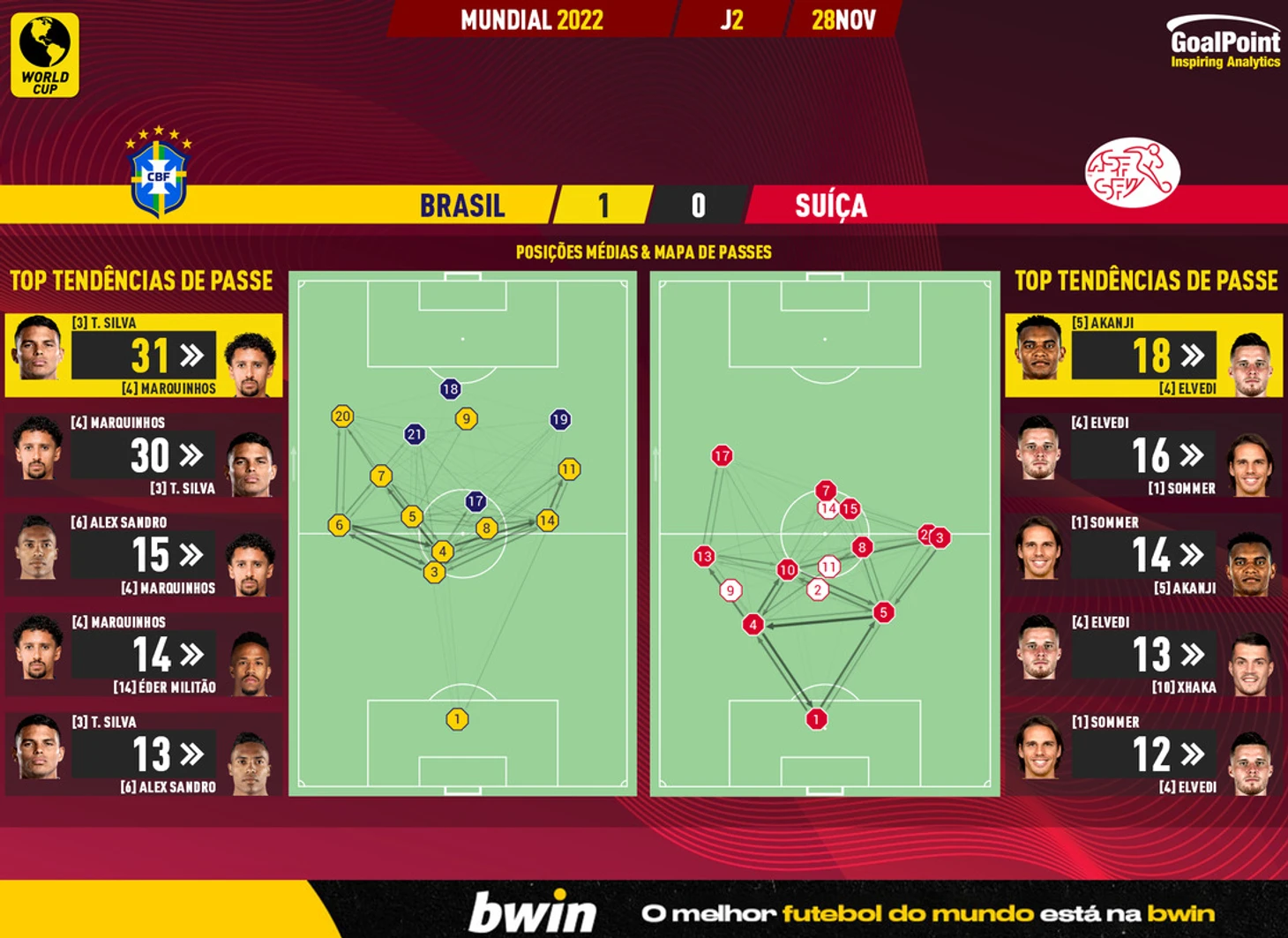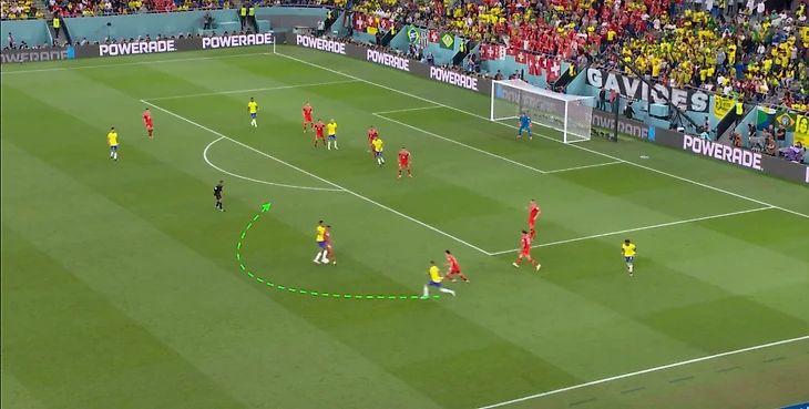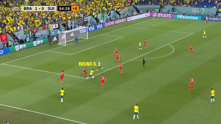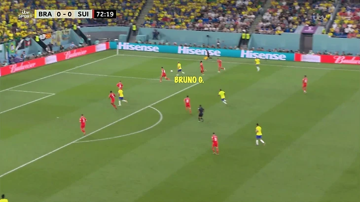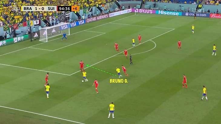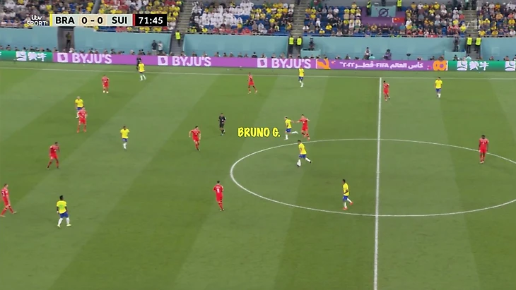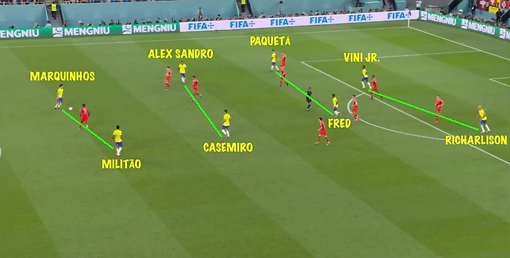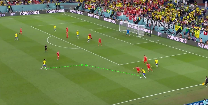 Швейцария усложнила жизнь Бразилии своей стратегией прессинга в первой фазе построения атак и насыщения центральной зоны полузащиты с регулярным давлением на владеющего мячом. В частности Рубен Варгас слева и Эмболо в центре, а также Джибрил Соу и Фабиан Ридер (последний справа) оказывали активный прессинг на бразильскую оборону, не давая им регулярно поддерживать вингеров, которые оставались в гордом одиночестве под присмотром пары опекунов.