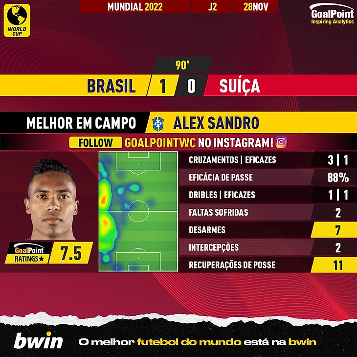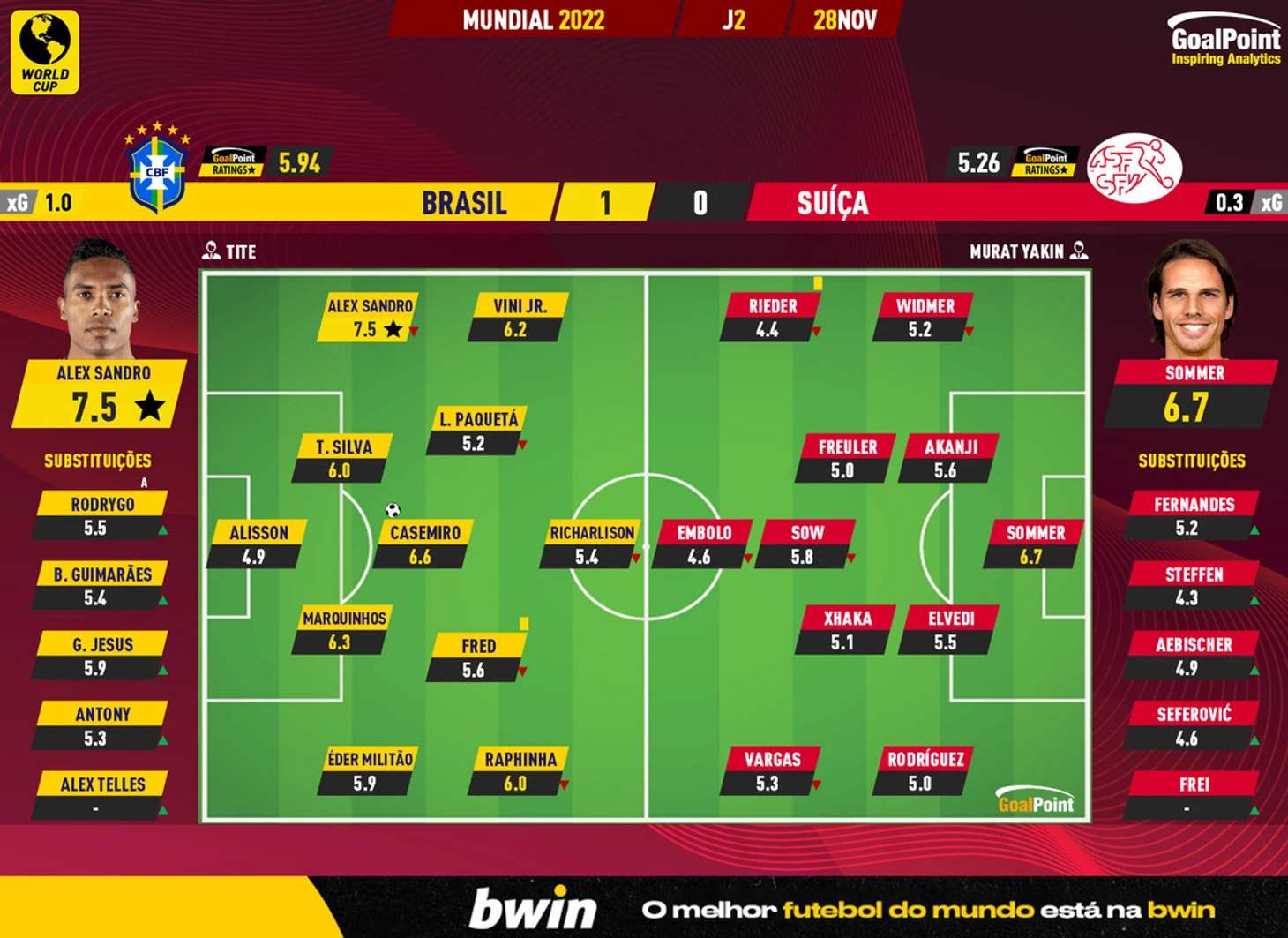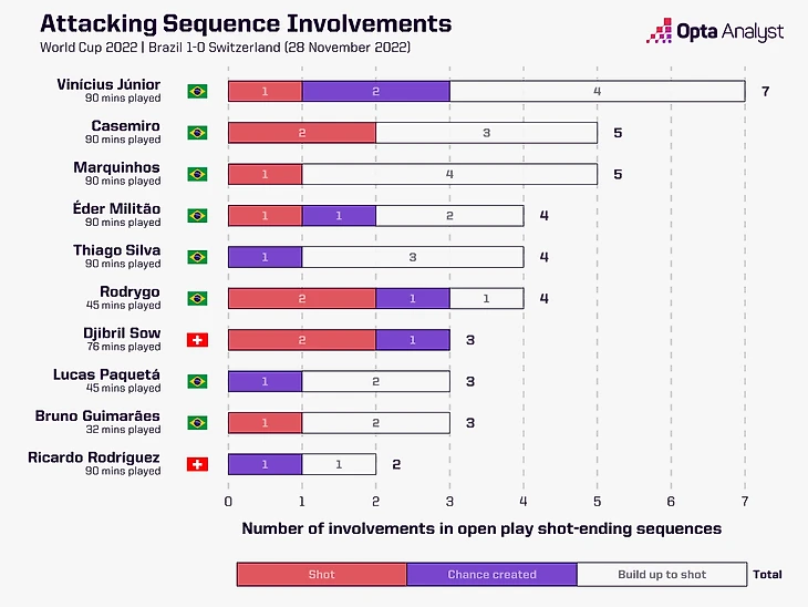 Вини против Швейцарии-самый активный игрок среди полузащитников и нападающих обеих команд- 88,9% точных передач (лучший результат) 2 ключевые передачи (тоже лучший) и 1 созданный голевой момент. Плюс по традиции н нем чаще всего фолили-5 раз.