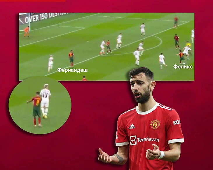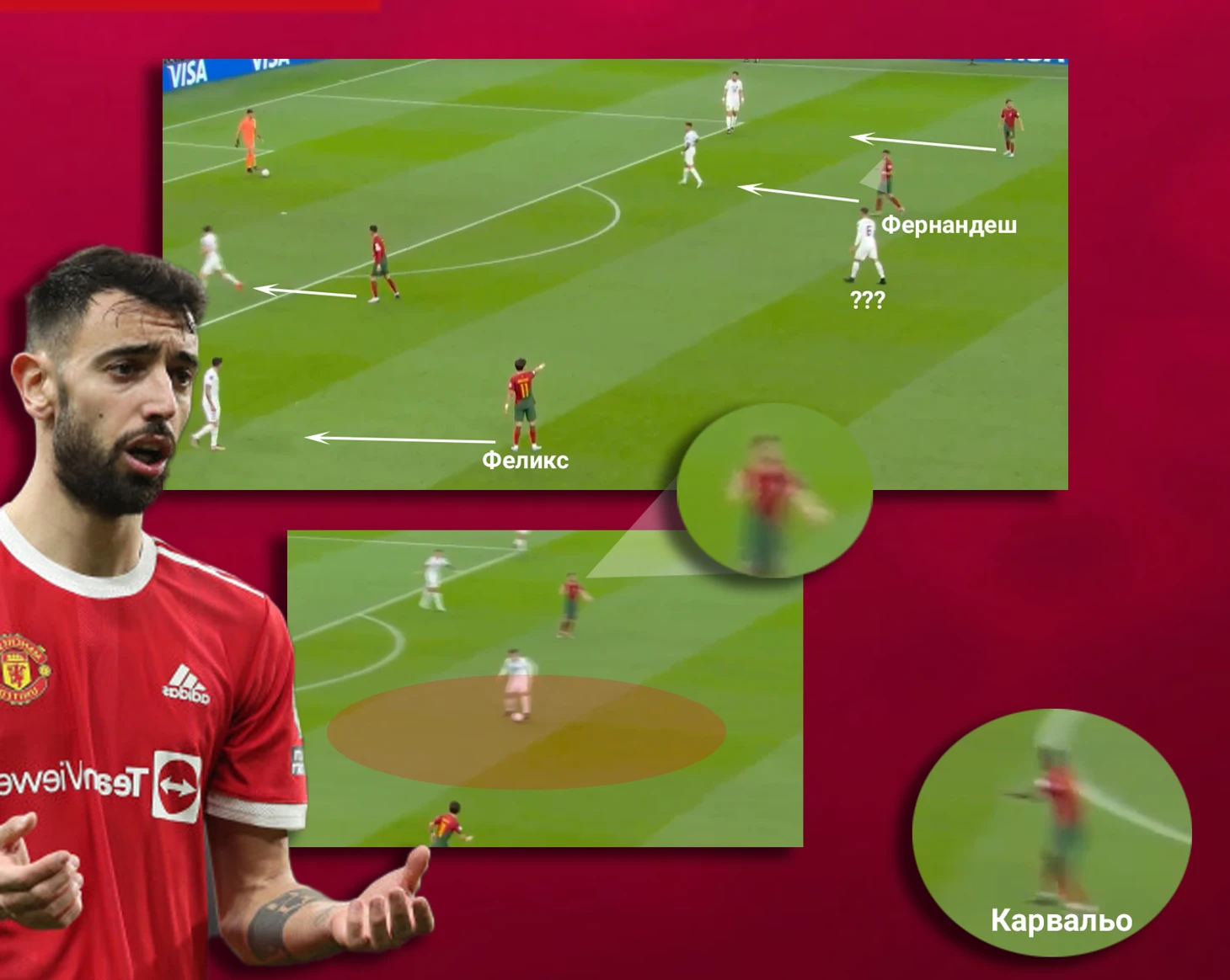 Бруно довольно требователен к партнерам. Это можно было заметить в МЮ, но и в сборной он не даёт поблажек. На нижней картинке, где Феликс решил ударить по воротам, Фернандеш требовал пас в разрез, но кажется на столь тонкую и скрытую передачу способен только сам Бруно.