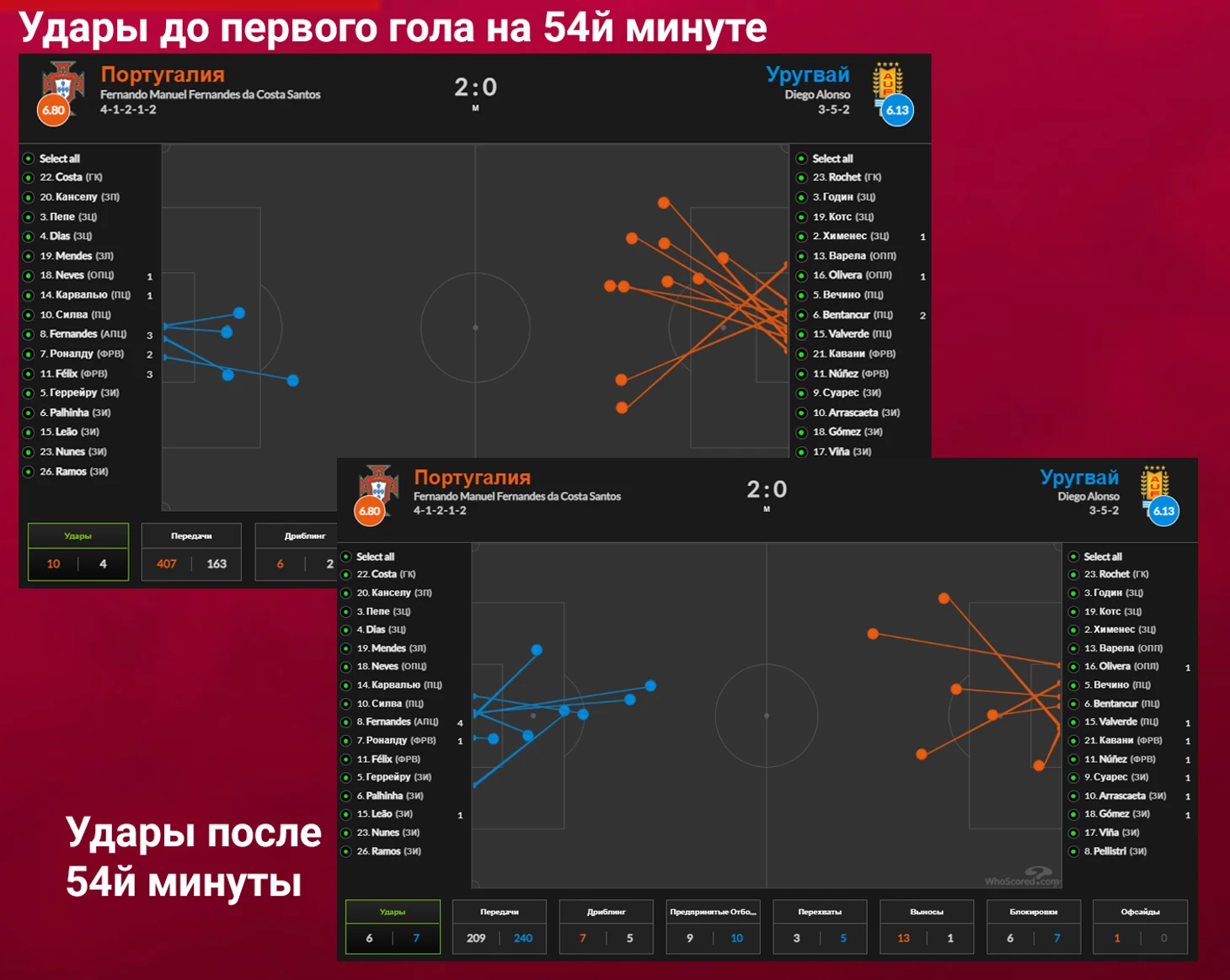 Футбол сборных хорошо олицетворяет сборная Португалии. Из-за недостатка сыгранности и тренерской работы у футболистов возникают разногласия, что сказывается на качестве игры. Например, против Уругвая португальцы не разобрались с ориентировками в прессинге и демонстрировали друг другу своё недовольство во время атаки соперника. Феликс указал на свободного игрока. У Бруно, как и у Жоао, уже был свой ориентир, а после того, как на опорного Уругвая прошла передача, Фернандеш сетовал на недоработку Карвальо, на что тот отвечал претензиями к Феликсу.