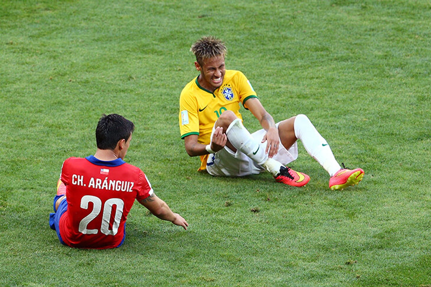 Сначала никто даже не воспринял это всерьез – пока Неймар лежал на животе, не двигаясь и крича, Бразилия продолжала атаку. На Неймара обратили внимание только после свистка Карлоса Веласко Карбальо из-за фола на Оскаре. Пока судья трусцой бежал к месту падения Неймара, рядом уже оказались Марсело и Давид Луиз.