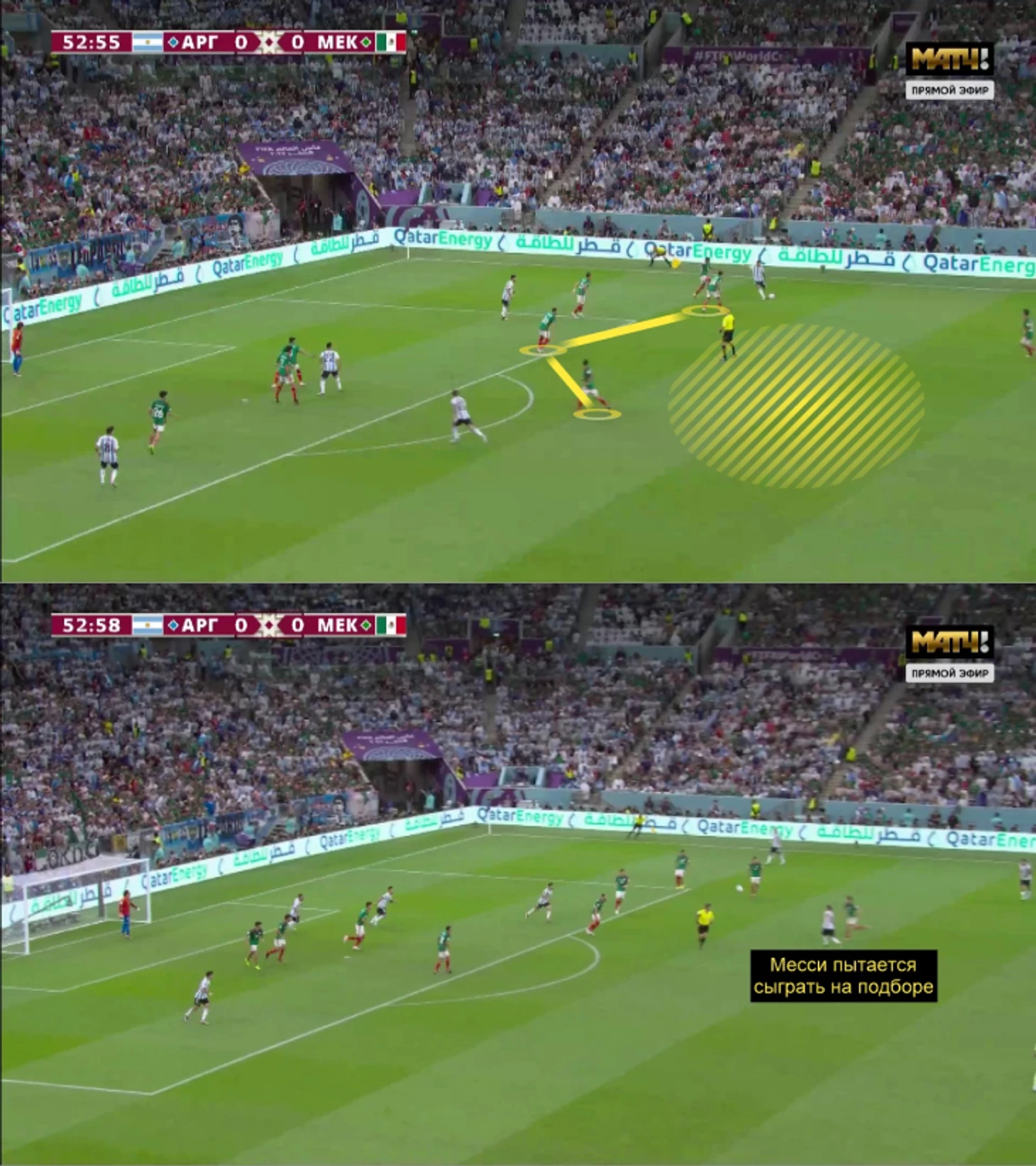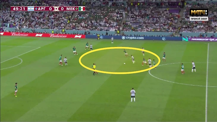 Первый тайм против Мексики – провал Аргентины. Команда Херардо Мартино вышла в 5-3-2 и стабильно передавала Месси в центре поля. Дополнительная проблема – непродуманное движение впереди. Родригес спускался в тройку к защитникам – это снижало концентрацию полузащитников в опорной зоне Мексики, тем более смена позиций Месси и Мак Аллистера была не так отлажена, как в следующей игре с Польшей. В итоге первый тайм превратился в сплошной перекат мяча назад и поперек.