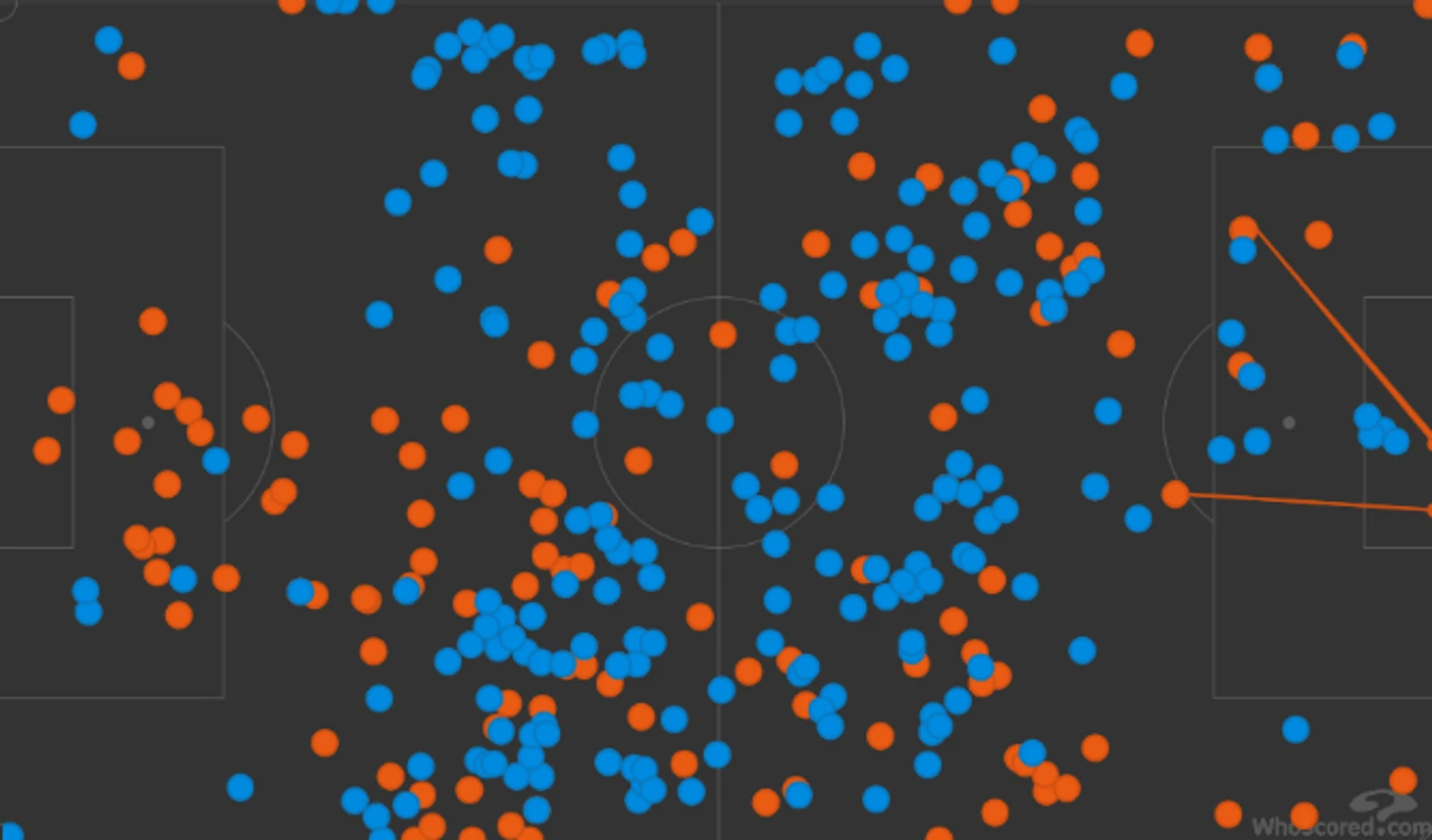 Карта касаний Аргентины и Мексики в последние 20 минут: слева – ворота Аргентины, справа – Мексики, оранжевые точки – Аргентина, синие – Мексика