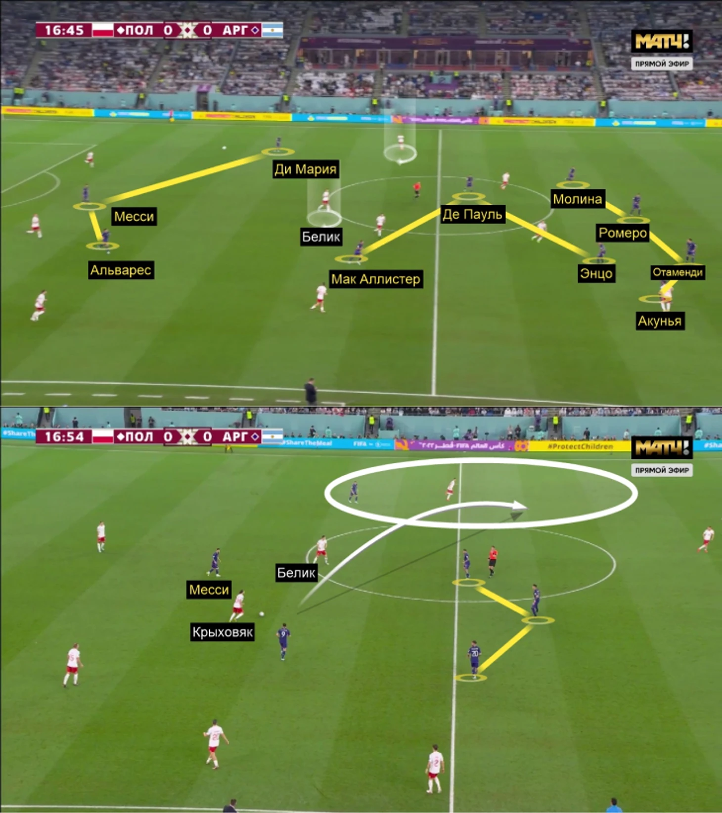 Другой эпизод: Месси пассивен, а за него отрабатывает Мак Аллистер. Для подстраховки Лео он бросил позицию и оголил зону. В эпизоде не произошло ничего страшного, но для наглядности введем дополнительную переменную: предположим, что Левандовски опережает Де Пауля, принимает мяч и переводит в середину, где Крыховяк и Зелиньски остались против Энцо (плюс есть вариант на фланге) – так Аргентина могла быть наказана за разрыв.