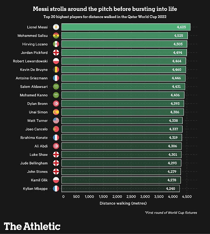 После первого тура Месси лидировал на ЧМ-2022 по дистанции, пройденной шагом. По данным The Athletic, даже вратари Джордан Пикфорд, Унаи Симон и Мэтт Тернер ходили чуть меньше.