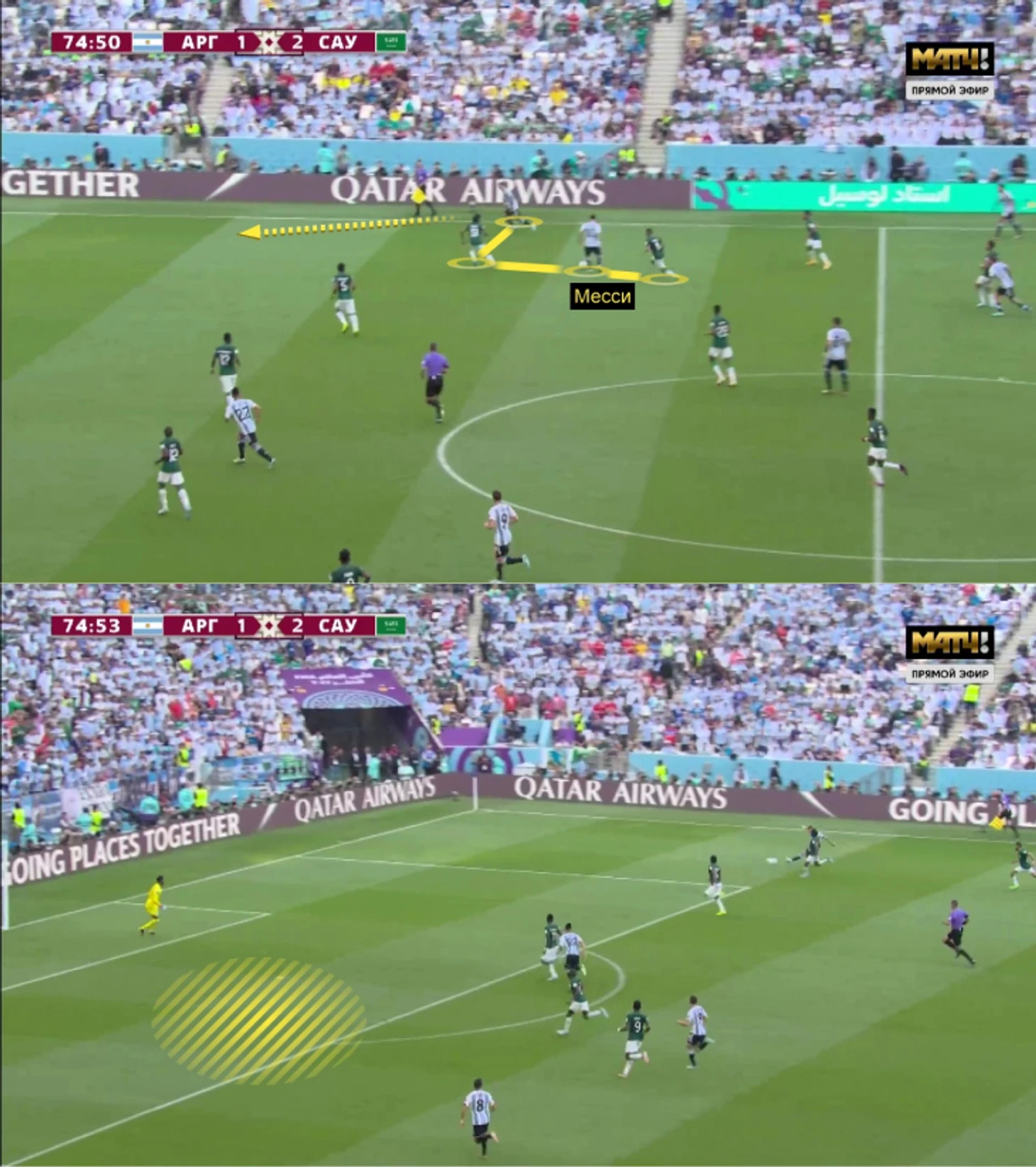 Месси все равно лидировал по ударам (4) и ключевым передачам (3), хотя провел не лучшую игру. В первом тайме Аргентина могла выиграть крупнее: Месси прекрасно считал пространство в начале игры (вратарь отбил), а затем саудовцы крайне рискованно организовали несколько искусственных офсайдов. Во втором тайме Месси оставался в тени (саудовцы хорошо его передавали и изолировали от партнеров, а сам Лео не тащил в одиночку), но даже в таких обстоятельствах он придумал главные моменты Аргентины:
