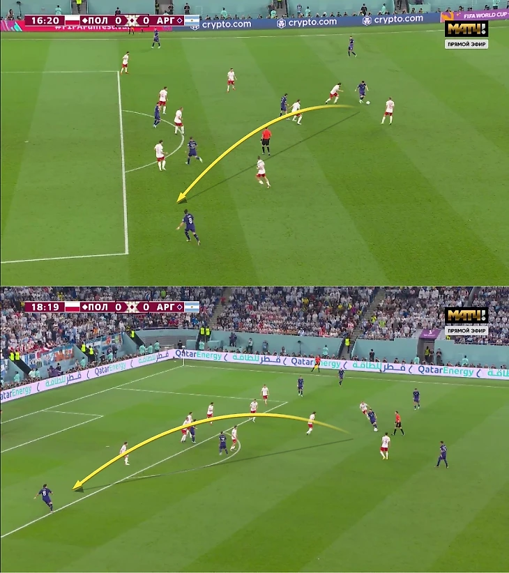 Месси был очень полезен при более продуманной структуре против Польши (спускался в опорную зону, обычно играл чуть правее): Акунья обеспечивал ширину слева, Ди Мария и Молина (плюс Де Поль) комбинировали справа, а Мак Аллистер смещался в нападение при игре Лео в глубине, Альварес приходил на фланг к Акунье или оставался в центре нападения. Задумку балансировали центральные полузащитники: Энцо и зачастую Де Поль оставались глубже и объемно помогали при атаках поляков.