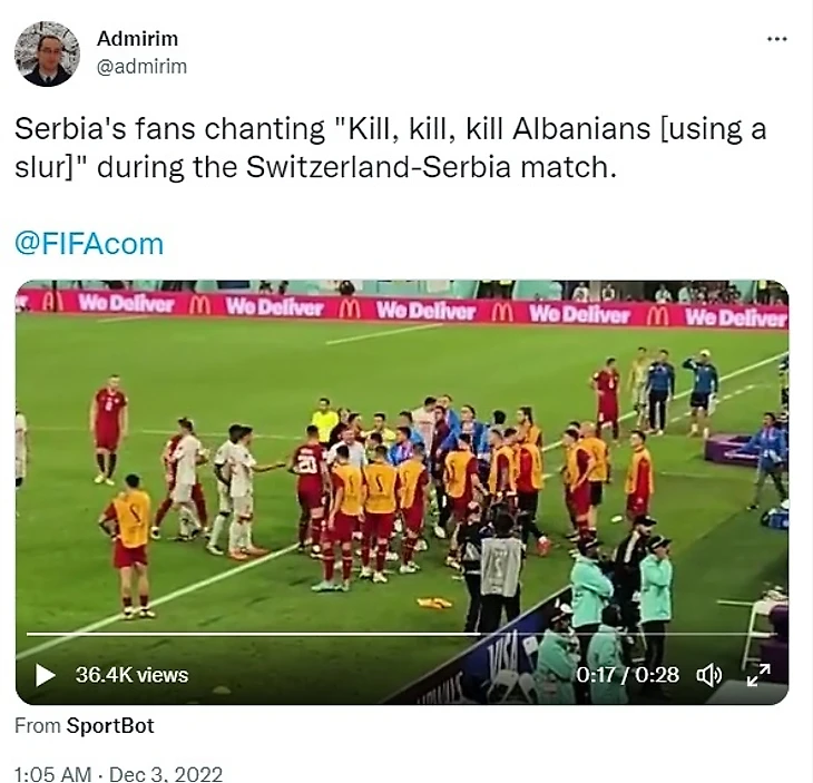 Во время столкновения сербские трибуны скандировали «убей албанцев» (снова этнофолизм «шиптар») , подстегивая своих игроков.