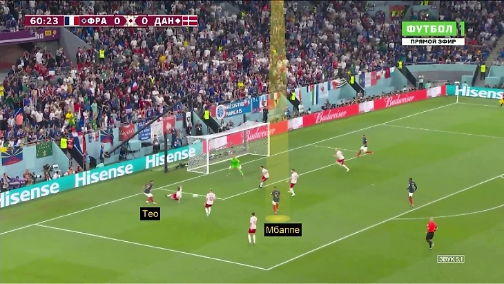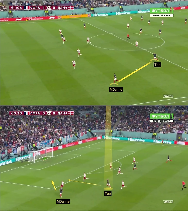 Первая голевая атака в матче с Данией – классный пример, как Тео интерпретирует подобные ситуации. Он оценил, где находится Мбаппе, пробежал по самому короткому маршруту, не передерживая мяч, а затем идеально вбежал в штрафную.