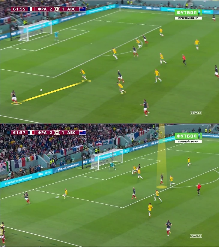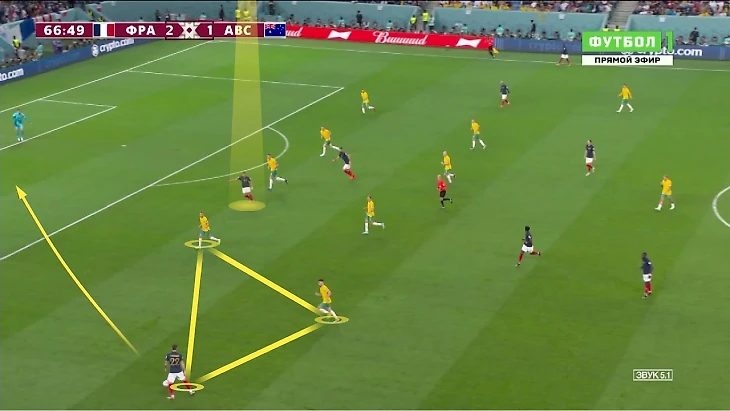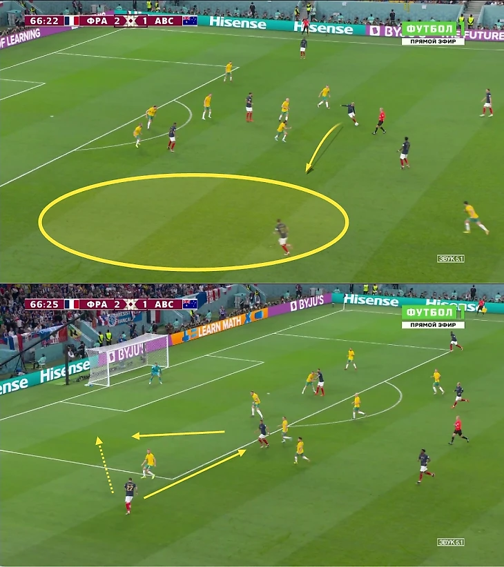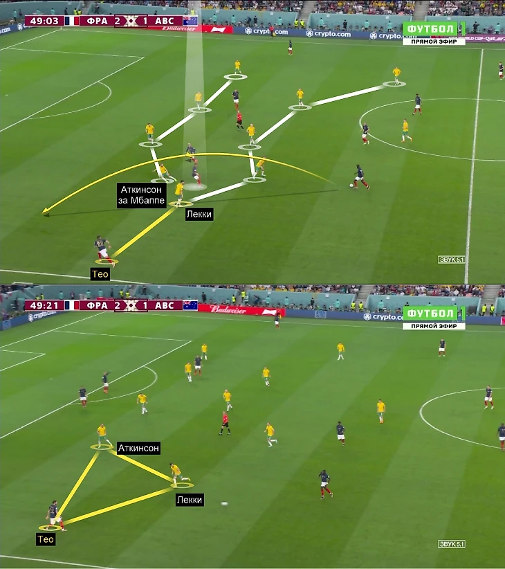 Тео доминировал против Австралии: отдал 7 продвигающих передач и 4 под удар, создал 4 голевых момента. Эрнандес пользовался свободой: пока Мбаппе мучил флангового защитника Австралии, вингер не садился за Тео пятым защитником. Килиан уходил в центр или спускался в глубину – это сужало позицию Аткинсона и освобождало зону для рывков Тео.