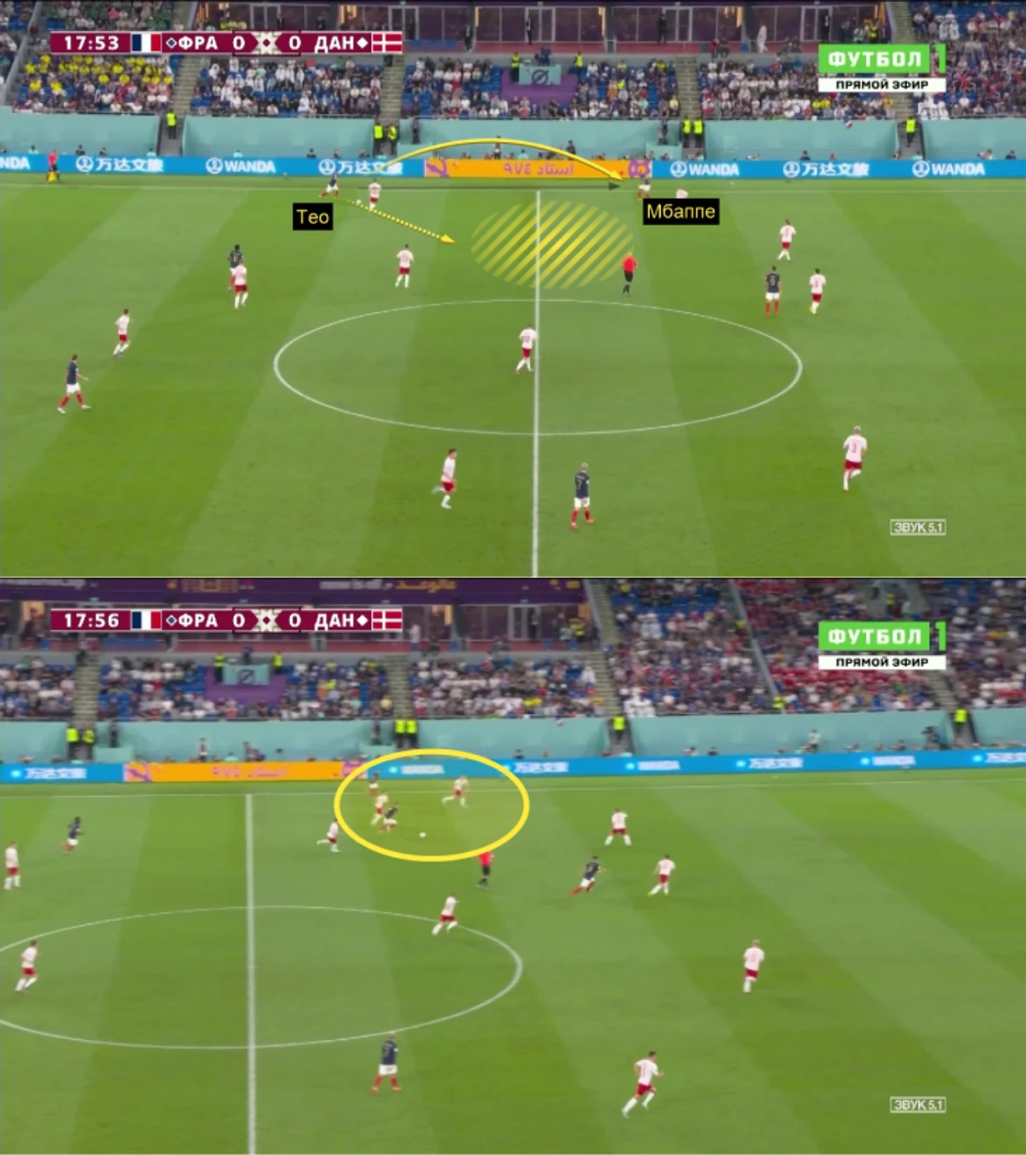 Во втором туре так и получилось: Тео чуть реже включался в атакующую треть, плюс влияла структура Дании (оборонялись пятеркой). Но даже несмотря на ограничения, Тео сыграл ярко: эпизодически протаскивал мяч на пространстве, забегал (Мбаппе в первом тайме проигнорировал пару хороших рывков) и навешивал.
