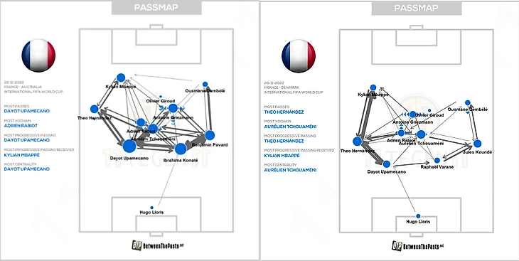 Сразу в первом матче (с Австралией) Эрнандес принимал диагонали и разрезающие передачи низом от центральных защитников, отдавал пасы на Мбаппе (и за спину, и в изоляции), органично распределил с Килианом атакующие задачи и дал ему больше свободы (Тео соблюдал ширину, а Мбаппе занимал позицию в полуфланге и около Жиру), заходил в середину и взаимодействовал с Гризманном.