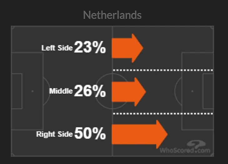 Еще одна мощная адаптация ЛВГ – тотальное давление на фланг Думфриса, который стал главным игроком матча. 50% атак голландцев шли через эту зону – 23% через противоположную: