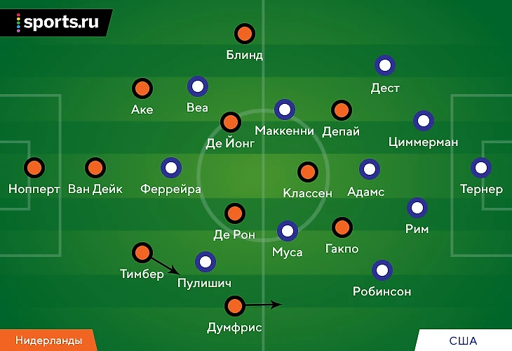 Сборная США подошла к матчу без адаптаций по части игры без мяча. Пытались прессинговать как обычно: то есть нападающий (Хесус Феррейра) играет по опорнику, а Кристиан Пулишич и Тимоти Веа в узких позициях давят на защитников. Это структура неплохо работала в группе, но у Нидерландов более гибкая схема. К трансформациям американцы оказались не готовы: