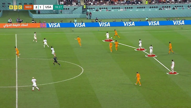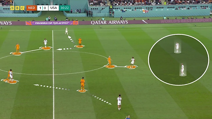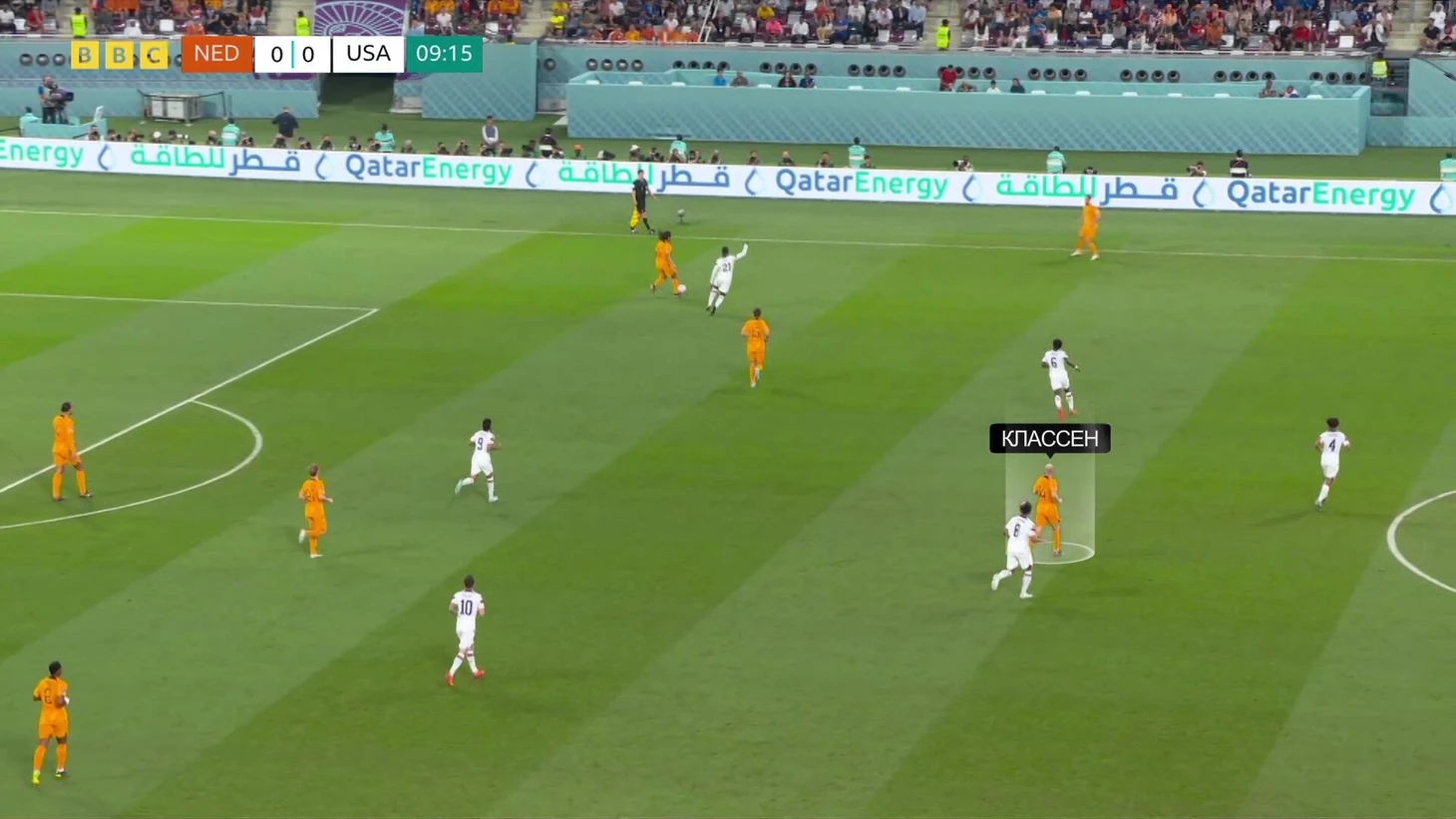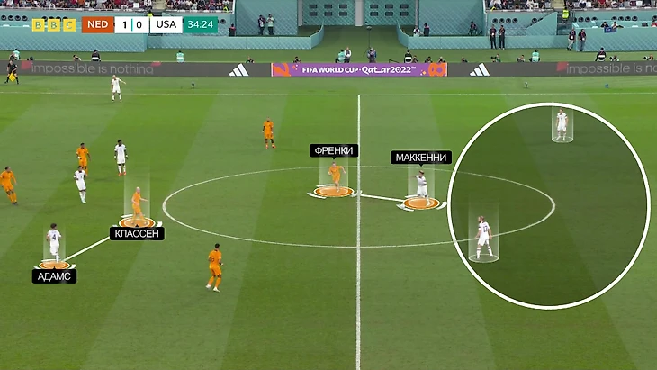 Идея хорошо заметна на примере этого эпизода. В полузащите Нидерланды перекрывают каждый вариант персонально. Классен даже поднимается за Тайлером Адамсом выше нападающих (Депая и Гакпо):