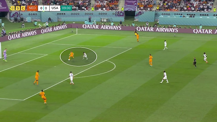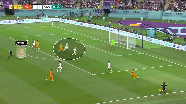 Голландская асимметрия наконец заработала: Блинд глубже и больше строит атаки, а Думфрис выше (почти вингер) проявляет себя в финальных стадиях. Она также отлично легла на рисунок матча. Во-первых, Нидерланды получили возможность больше контратаковать (владение 58% на 42% в пользу США), что удобно Думфрису. Во-вторых, из-за акцента на правый край усиленно кормили Думфриса в позиционных атаках – освобождали от работы в продвижении и позволили заниматься уничтожением прямого оппонента (Робинсона).
