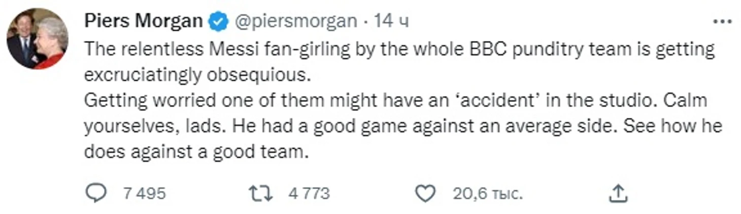 Пирс Морган приложил экспертов BBC, сборную Австралии и Месси. Кажется, у него есть мнение обо всем на свете
