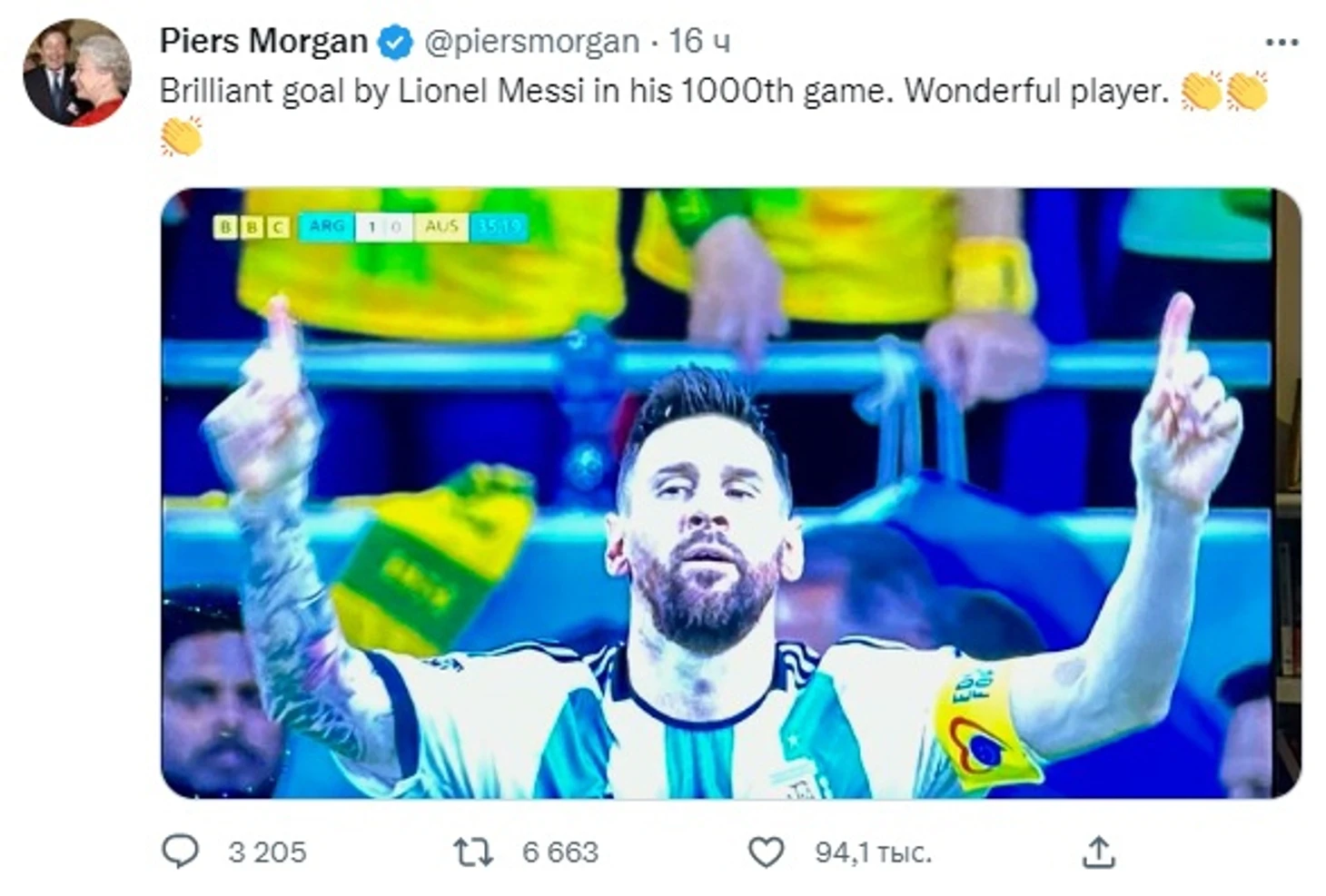 Журналист Пирс Морган, который недавно провел интервью с Роналду, остался недоволен тем, что в студии BBC эксперты хвалили Месси после победы Аргентины над Австралией в ⅛ финала чемпионата мира.
