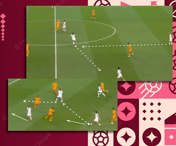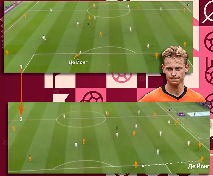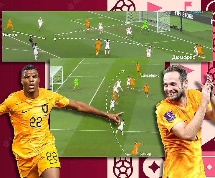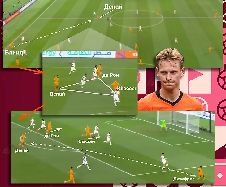Несколькими провоцирующими движениям Де Йонг всё выше стягивал оппонента, после чего отдал мяч на правый фланг,а затем развернул на левый. Такой перевод мяча с фланга на фланг хорошо растянул построения США (обратите внимание на расстояния между игроками Америки), что позволило Блинду отдать передачу на опустившегося Депая и комбинацией в треугольнике довести мяч до Дюмфриса. В финальной трети ключевую роль сыграли Де Рон и Классен, которые движением освободили зону для удара Мемфиса, а также Дензел (крайний защитник!) который отдал голевую