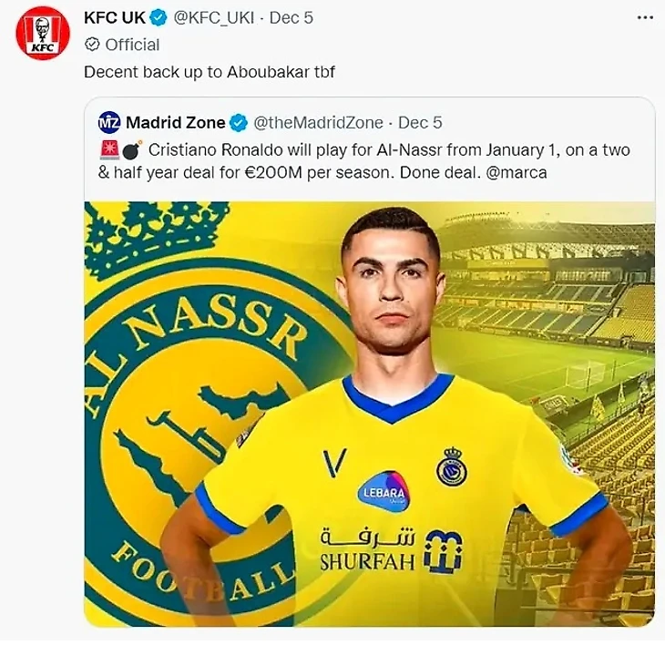 Главной звездой клуба из Саудовской Аравии сейчас является Венсан Абубакар, поэтому в KFC решили протроллить Криштиану, написав в Twitter: